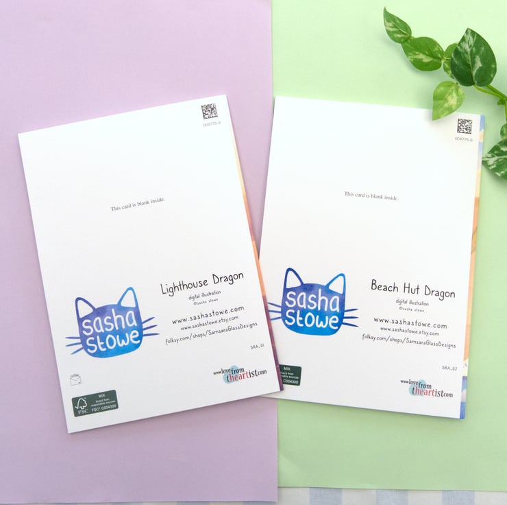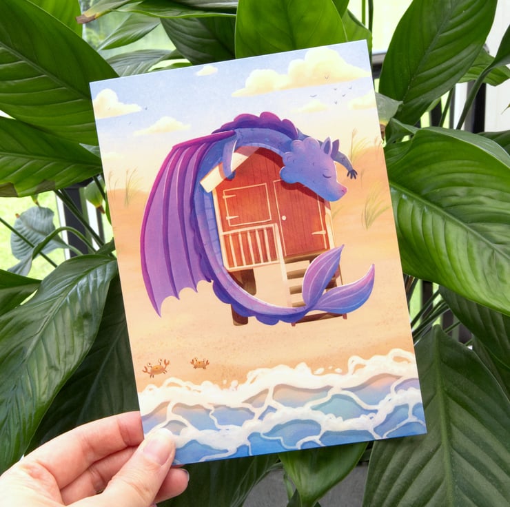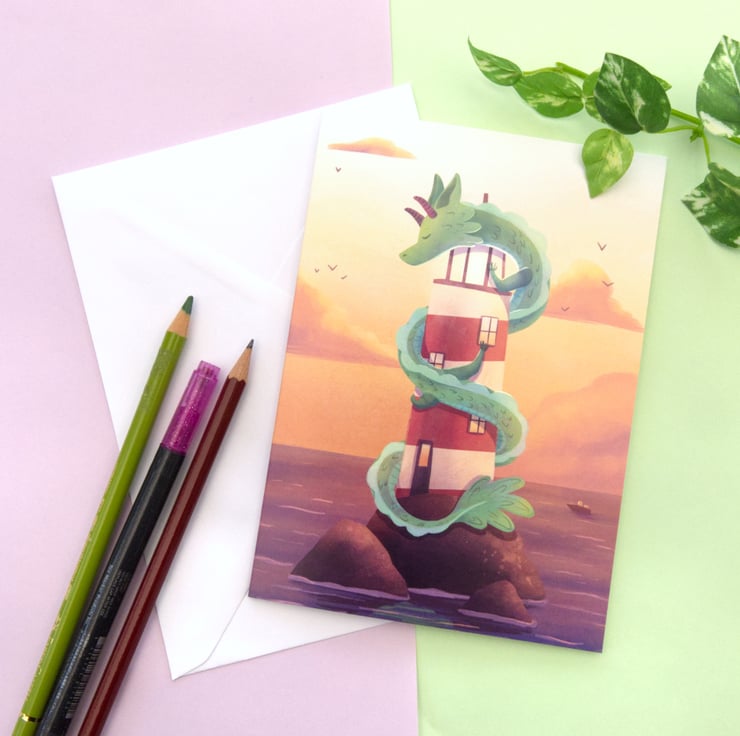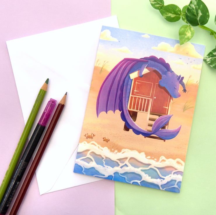A sleeping dragon around a lighthouse and a sleepy dragon around a beach hut. Each is sold separately, just select which design you'd like from the drop down menu. The card is blank inside so it's perfect for birthday, congratulations, Father's Day or even just to say hello.