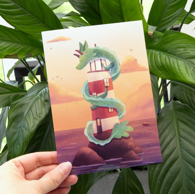 A sleeping dragon around a lighthouse and a sleepy dragon around a beach hut. Each is sold separately, just select which design you'd like from the drop down menu. The card is blank inside so it's perfect for birthday, congratulations, Father's Day or even just to say hello.