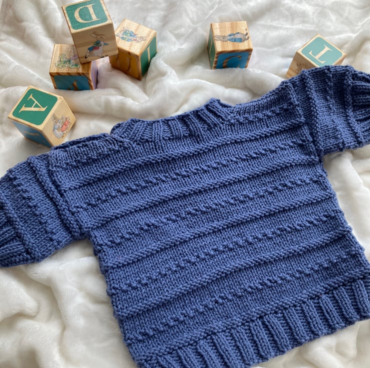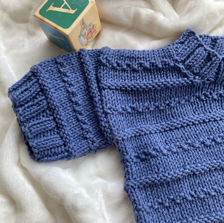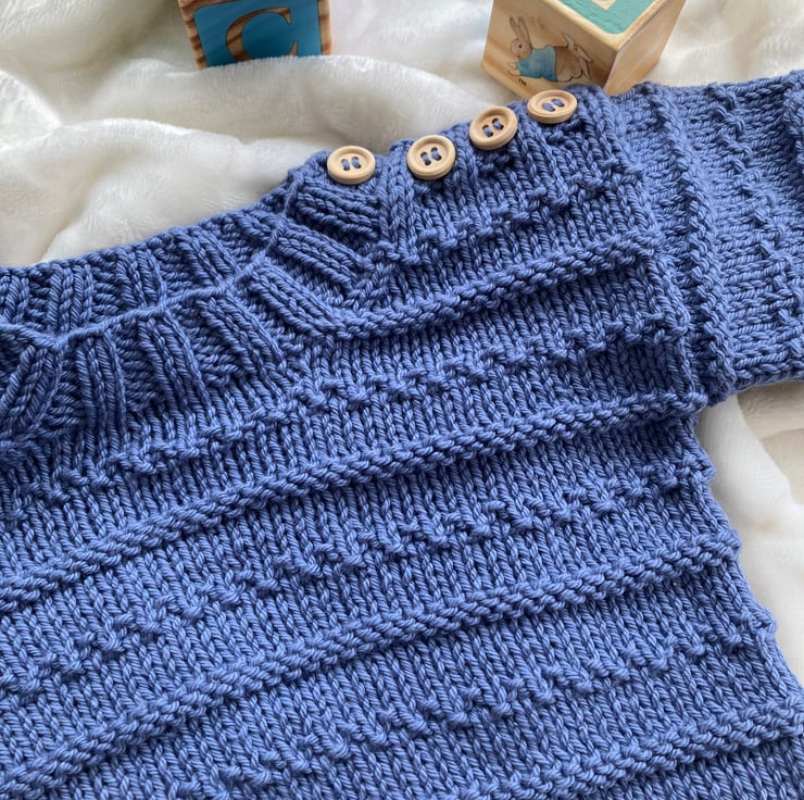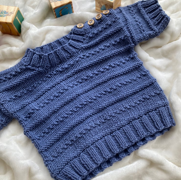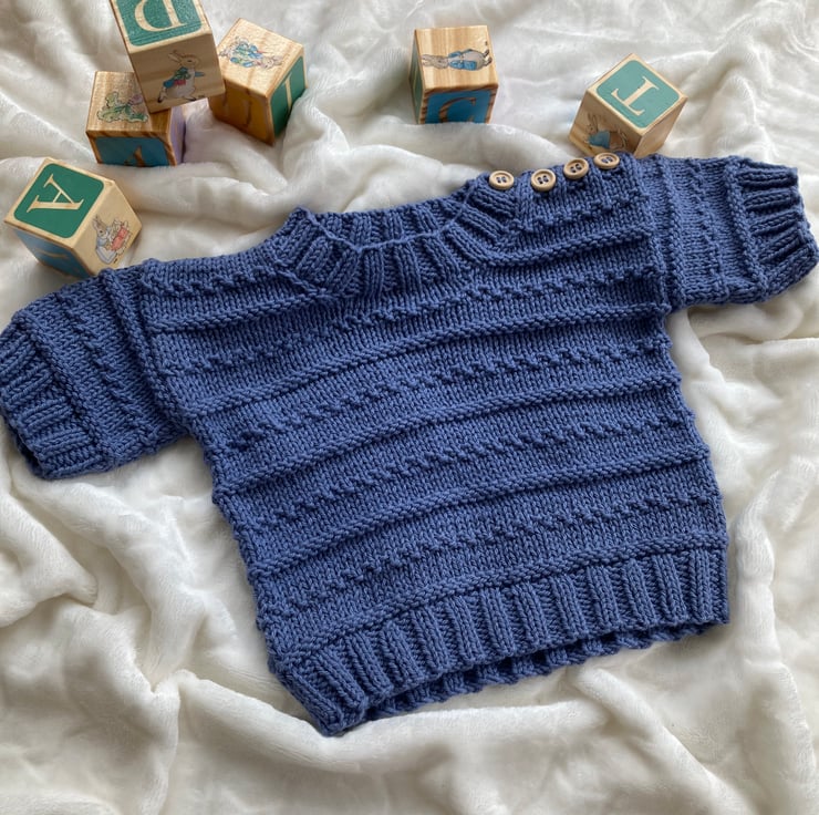 I have knitted this cute little jumper using a cerulean blue pure cotton yarn - making it cool and breathable for your little one on those hot summer days. Wooden buttons on the shoulder make it easier when dressing a wriggling baby and make a contrasting feature. The varied stitches used also give added texture to this lovely jumper.