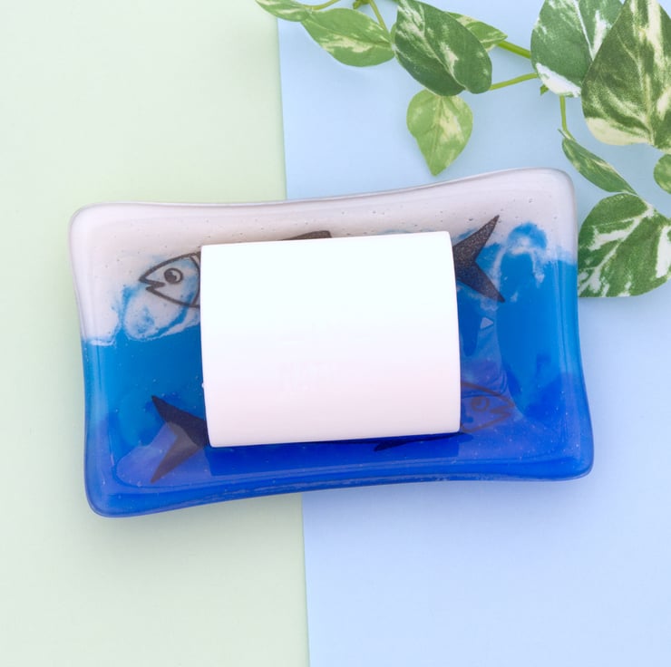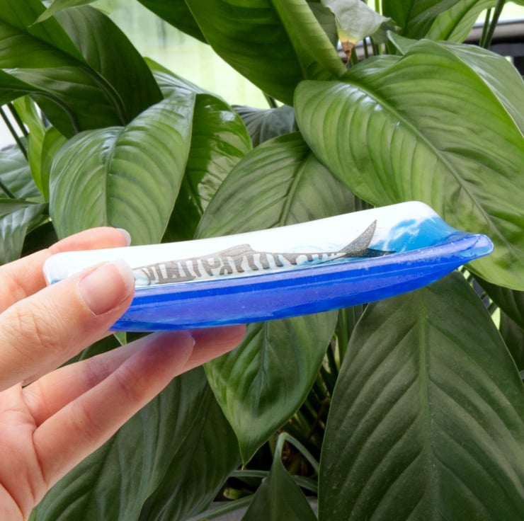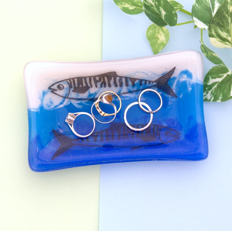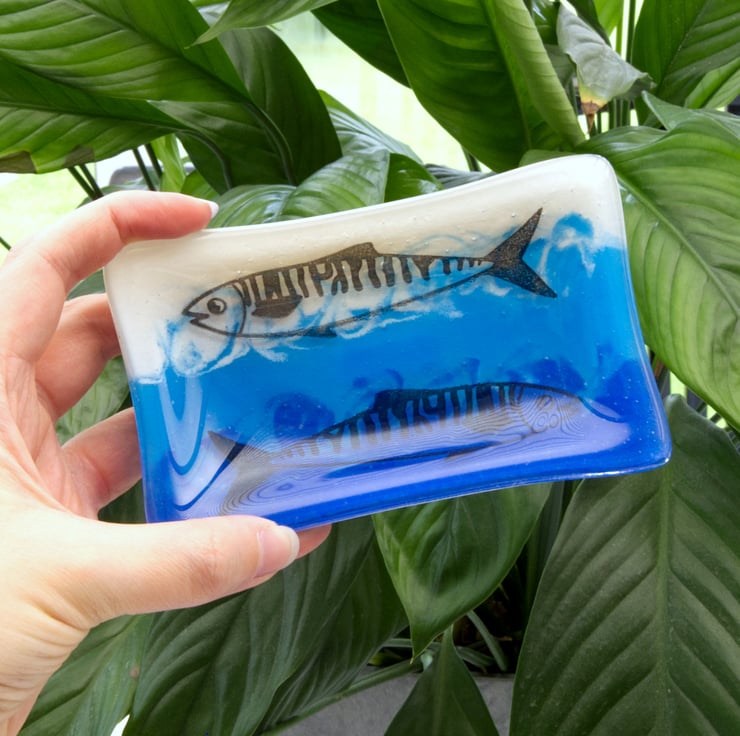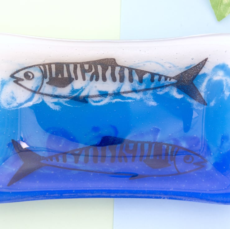 A beautiful blue fused glass trinket dish featuring two mackerel fish. The watery blues have been created by applying wet powdered glass to a layer of sheet glass then swirling the different colours around. The fish have been powder printed onto the top. It is then melted in a kiln to fuse all the layers together before going in for a second firing to slump the dish.