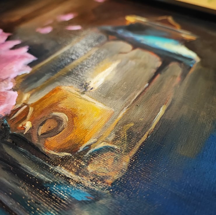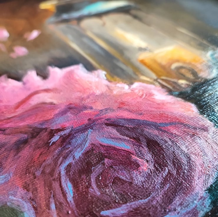 Experience the romantic and intimate atmosphere of "Rose by Candlelight," a stunning original oil painting by Ben Ashworth. This exquisite piece depicts a beautiful rose illuminated by the warm glow of candlelight. The artist has meticulously captured every intricate detail, from the delicate veins to the soft, velvety texture of the rose petals. The deep, rich colors and the subtle interplay of light and shadow make this painting truly captivating.