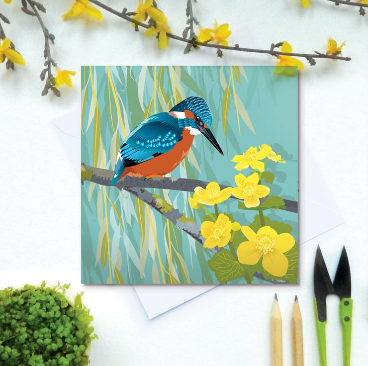 - Kingfisher on the Riverbank with bright yellow Marsh Marigolds