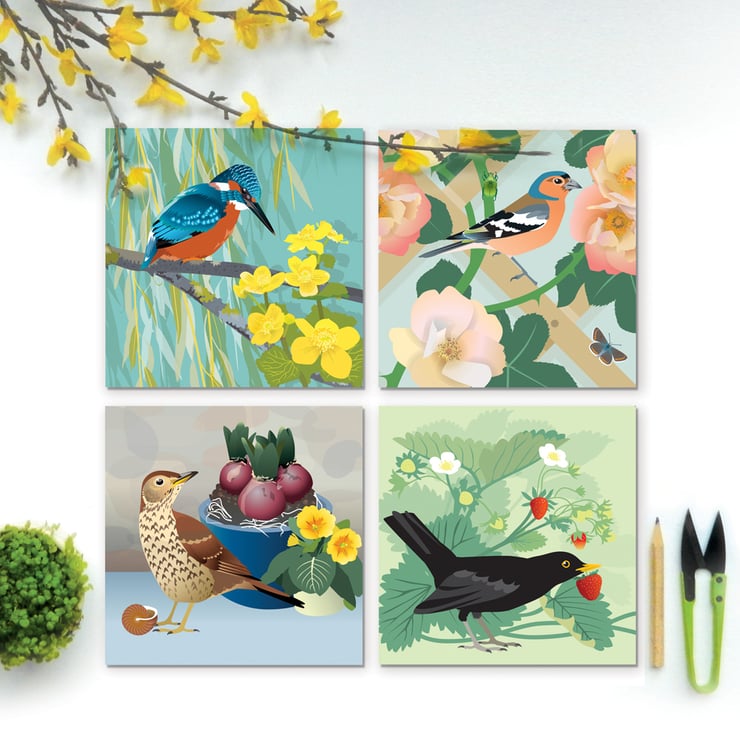 This set of four unique designs features some of our favourite garden birds, each paired with seasonal flowers and berries for a true taste of an English summer: