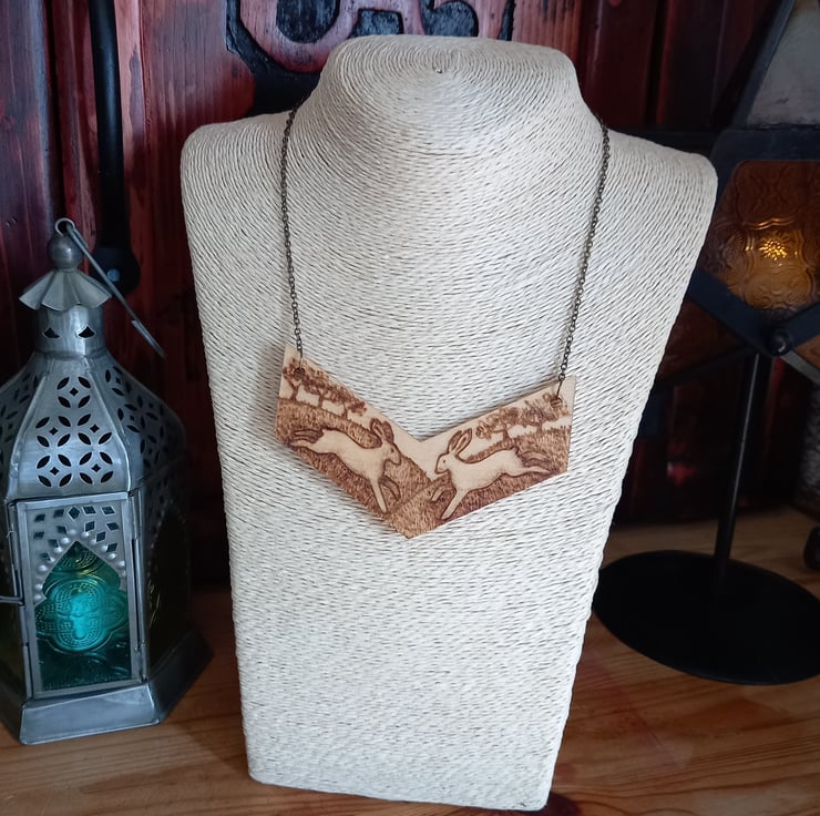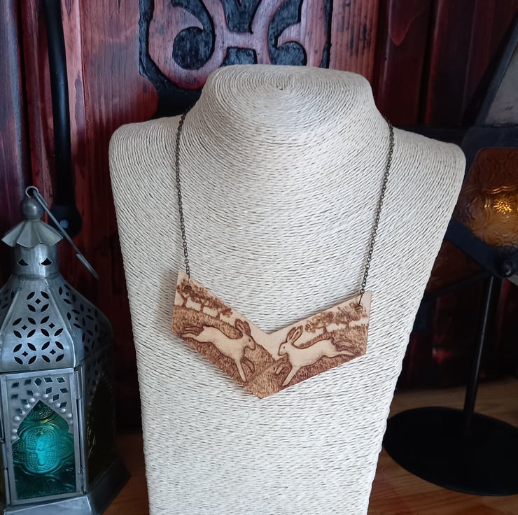 Wooden pendant illustrated with hares using pyrography (wood burning).