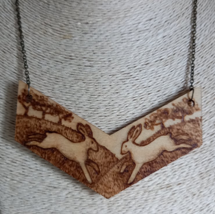 Wooden pendant illustrated with hares using pyrography (wood burning).