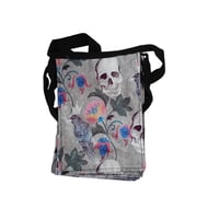 A handmade, faux leather shoulder bag with tarot fabric lining, inner pockets, magnetic closure and metal hardware. The bag measure approx 30cm high and 38cm wide.