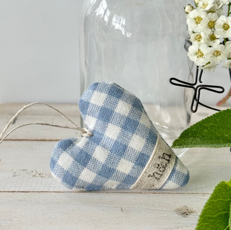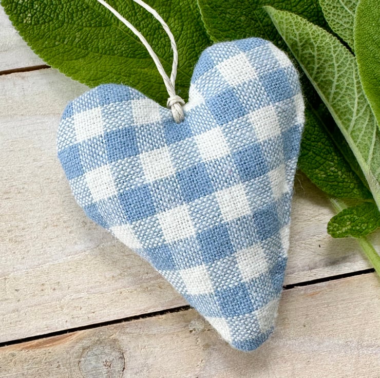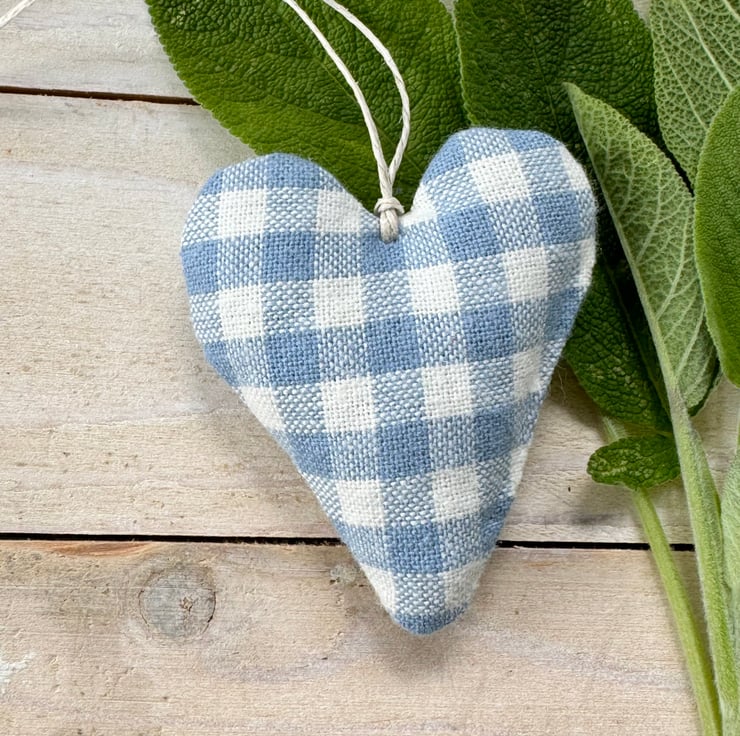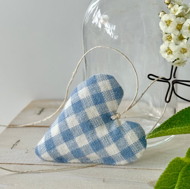 Handmade in superior quality woven cotton, with delicate pale blue and white gingham checks front and back, filled with wonderfully fragrant Hampshire lavender and complete with natural hemp twine hanging ties.