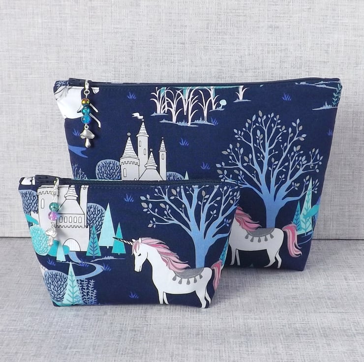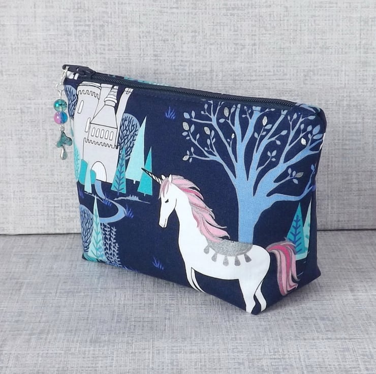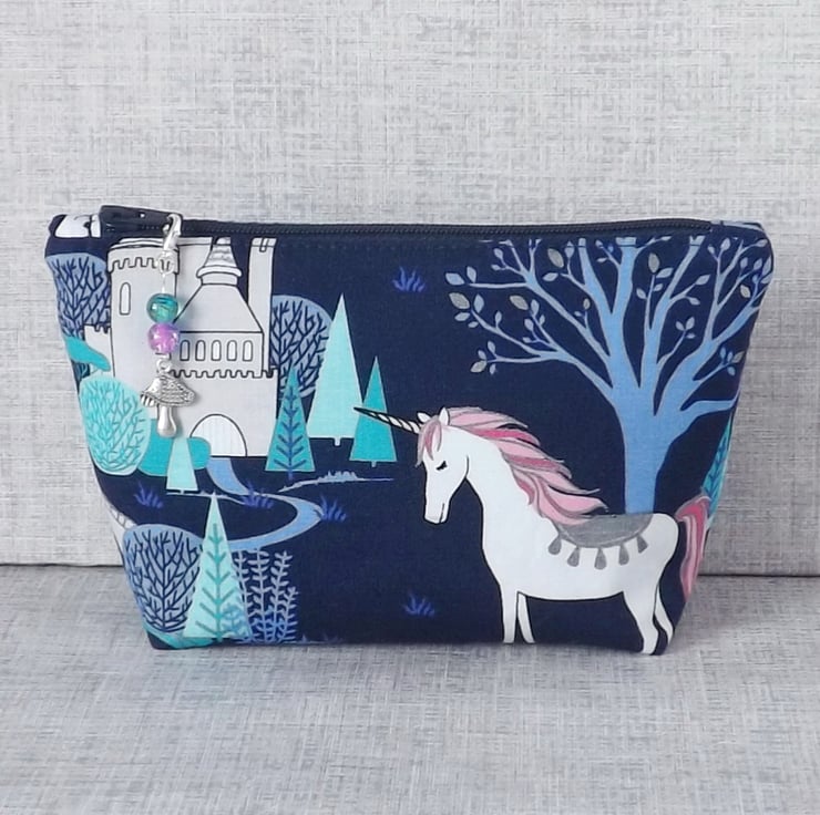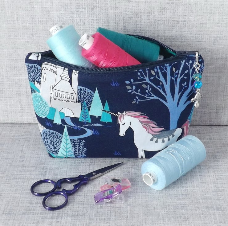 The main patterned fabric is 100% cotton with a unicorn, castle & trees design in shades of blue, turquoise, grey, white & pink on a dark blue background.