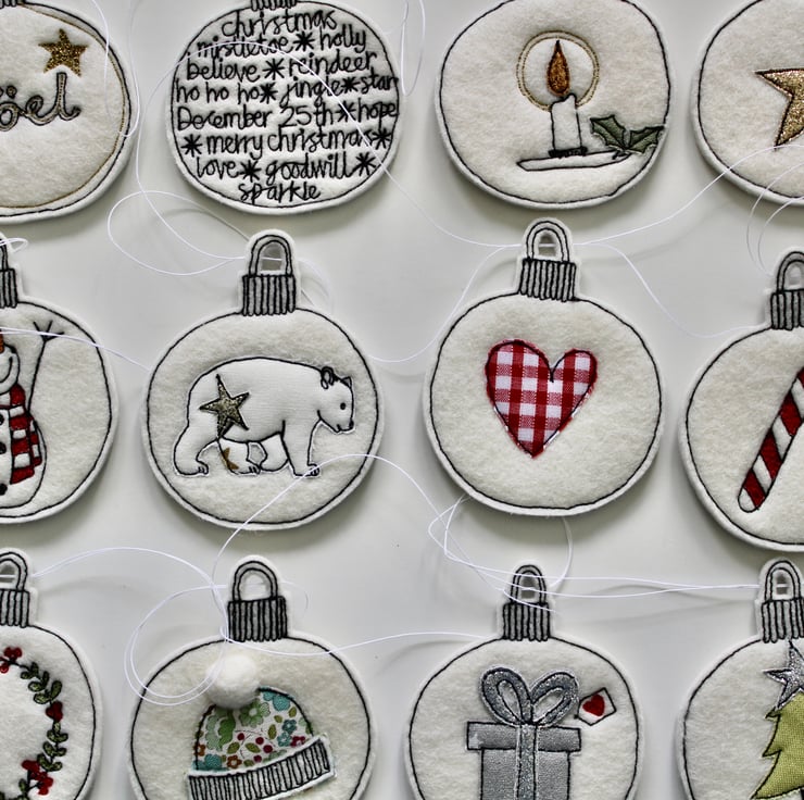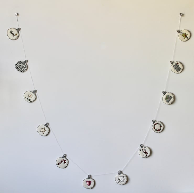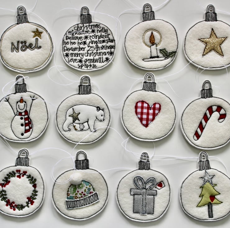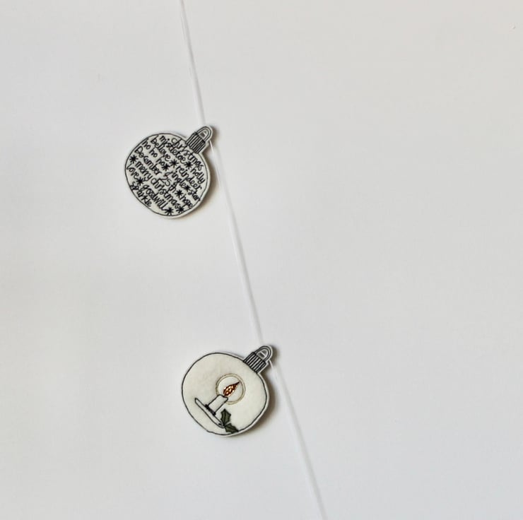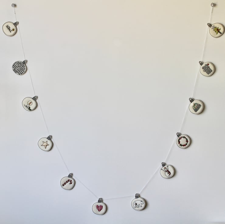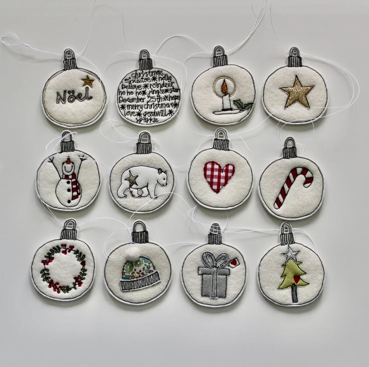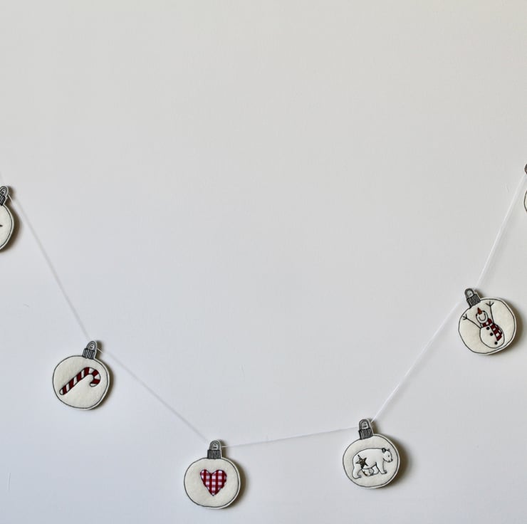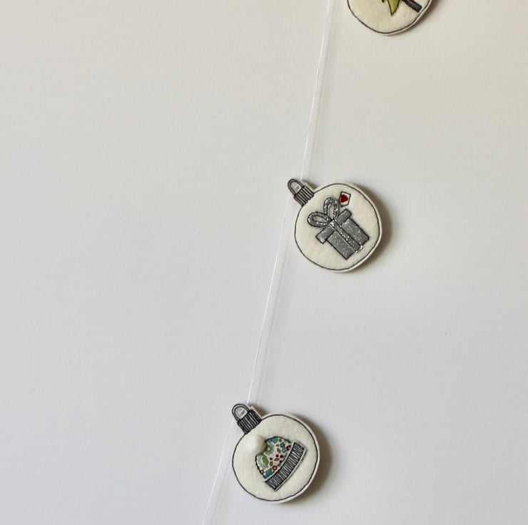 Each of the twelve baubles suspended along this garland, is sewn using a combination of 100% wool felt, cotton cloth, glitter cloth and free hand machine embroidery; multiple layers of cloth are sewn together and cut out by hand using very sharp scissors.
