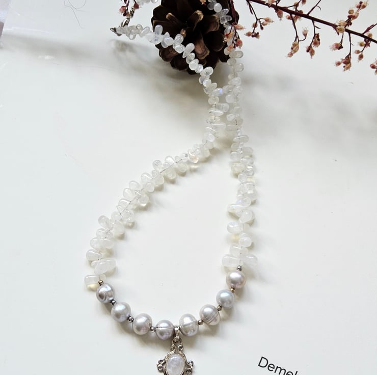This gorgeous necklace has been designed and hand crafted in Cornwall using irregular cut Sri Lankan moonstone drops. The drops graduate in size from front to the back. To compliment them 7-8 mm ash grey freshwater baroque pearls adorn the necklace with 2mm sterling silver beads adding a touch of sparkle. In the centre of the necklace is a 10mm by 7mm quality Sri Lankan oval white moonstone set in a decorative sterling silver pendant mount. It has been incorporated within the construction of the necklace and can not be taken off. It has a 925 stamp for sterling silver on back of the bail.