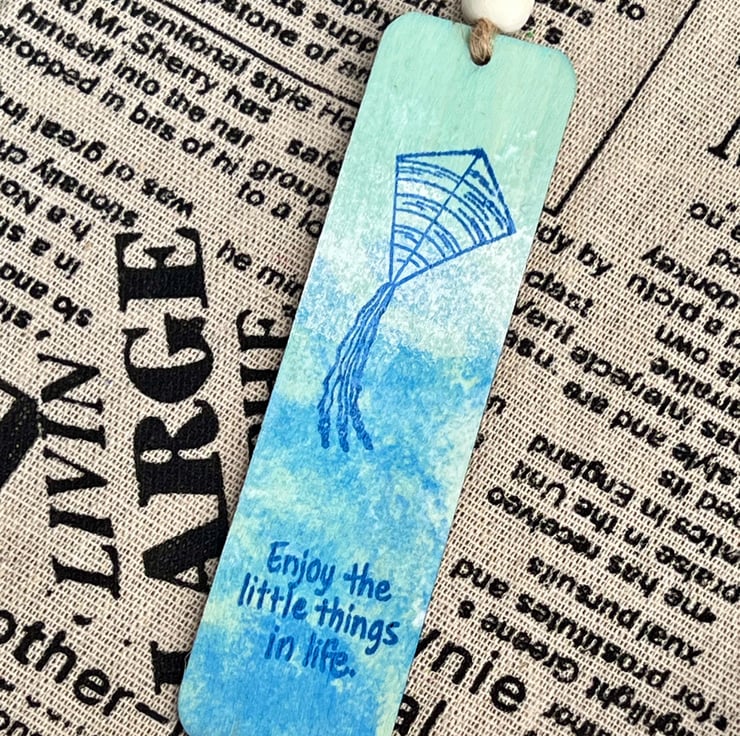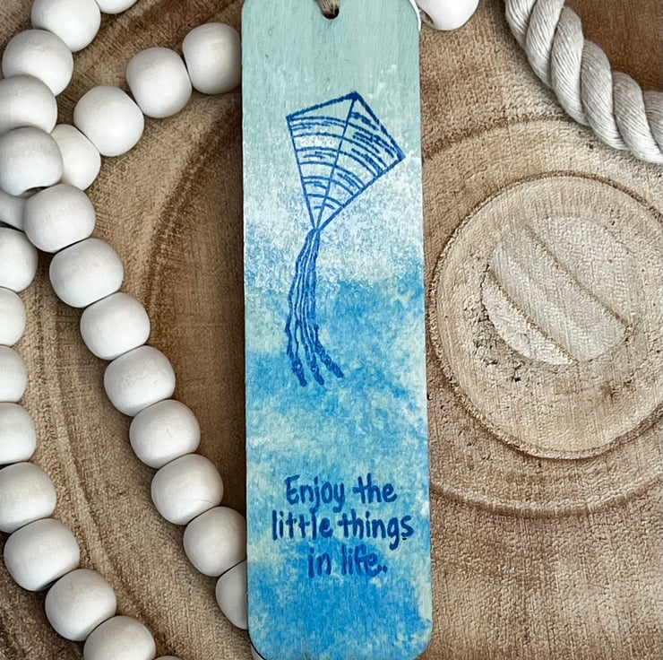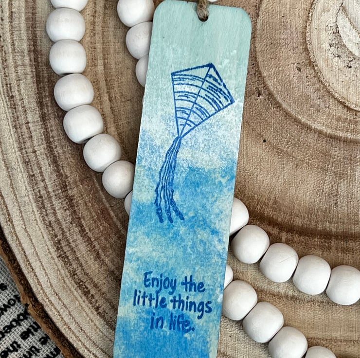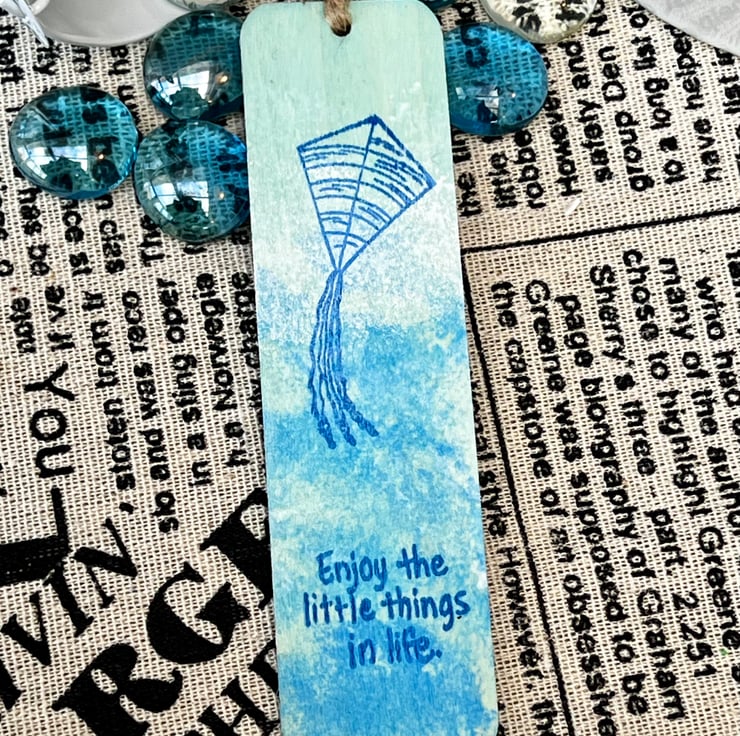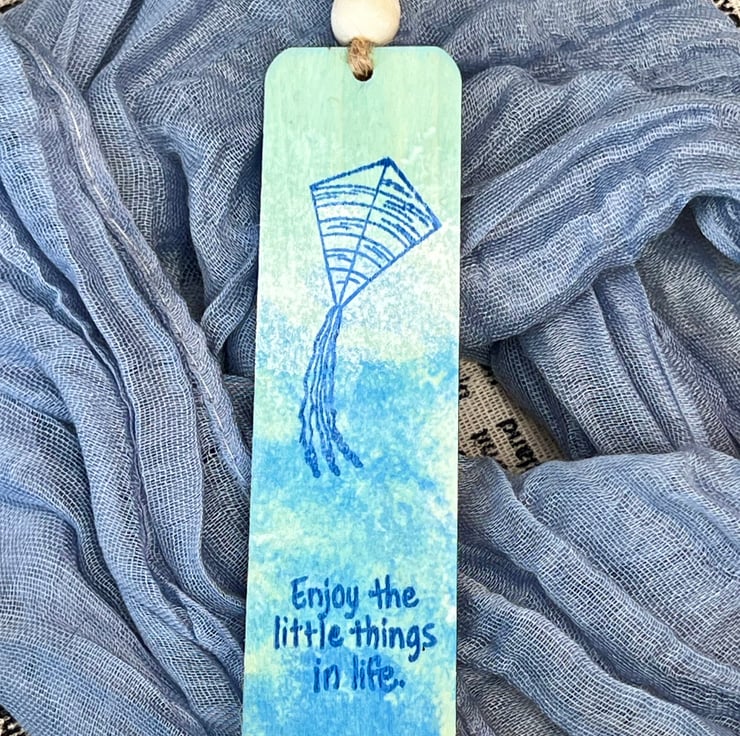 This unique and charming craft comes stamped with the words ‘enjoy the little things in life’ and is hand painted with acrylic paints by me. The kite bookmark is finished off with a wooden bead on the string.