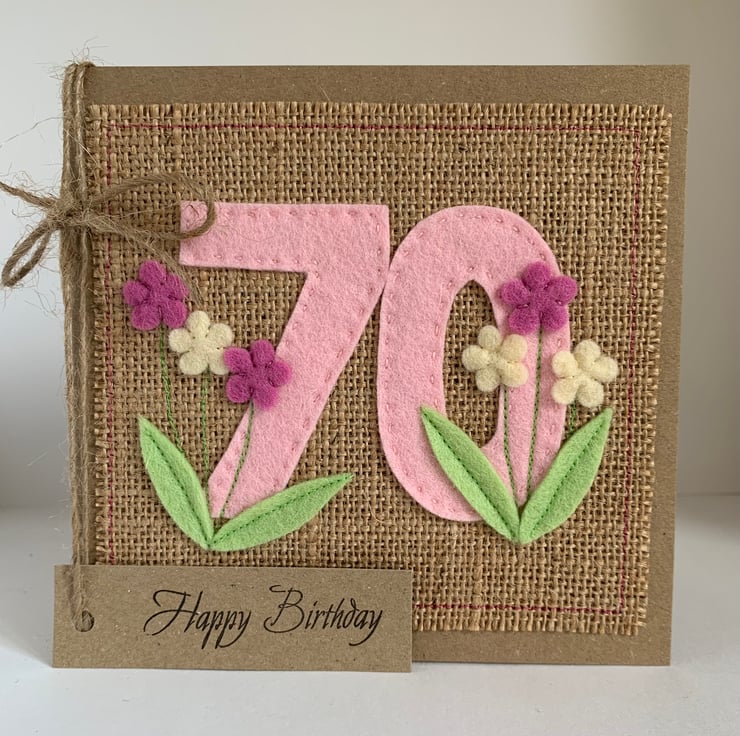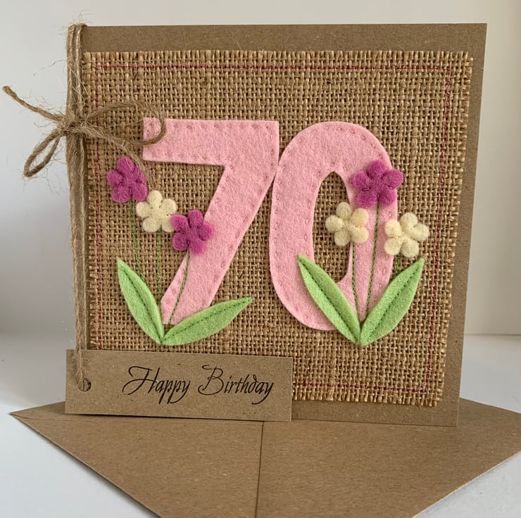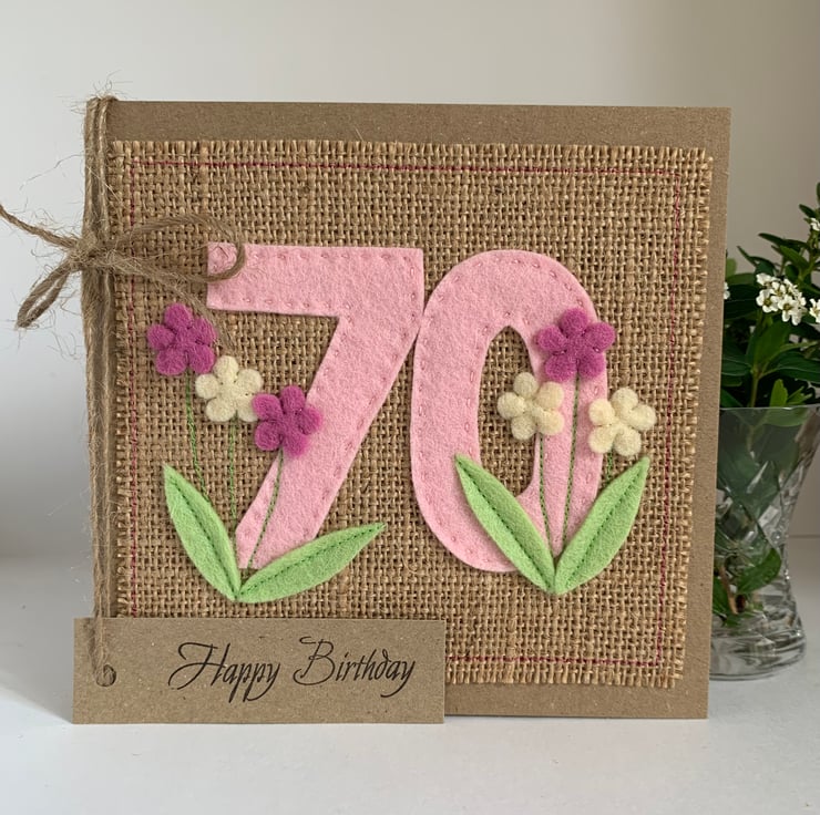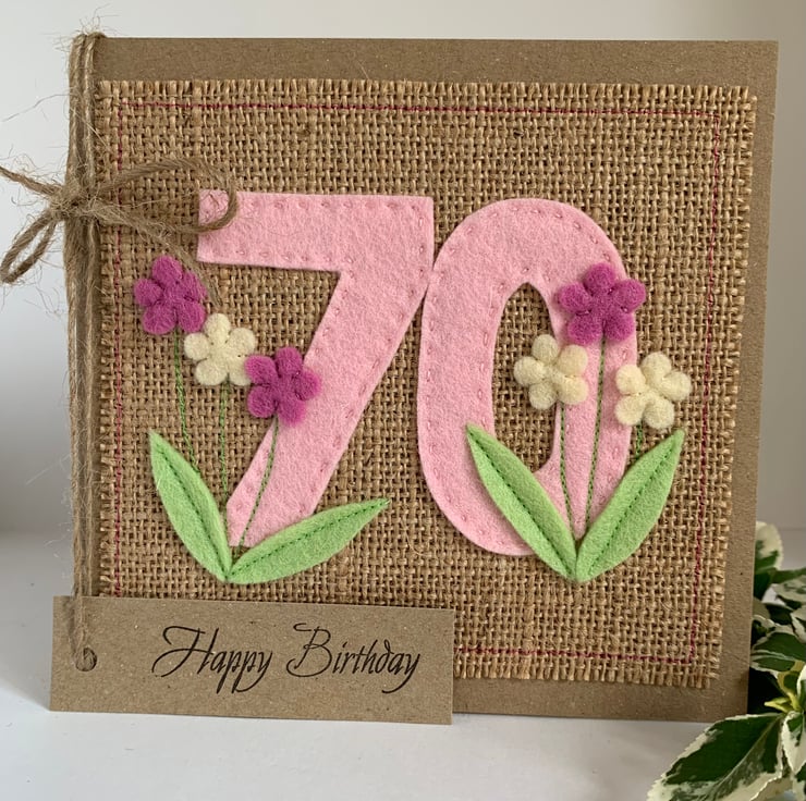 A unique handmade card for a special birthday. The numbers for this 70th birthday card are hand cut from pale pink wool felt and hand sewn to a hessian background. Flowers in rose pink and cream and are added to decorate the card.