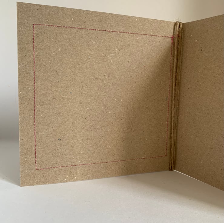 The hessian is machine stitched, using a contrasting thread, onto a plain brown recycled card. This stitching is visible on the inside of the card.