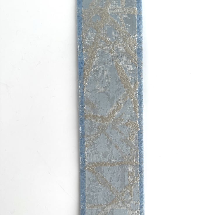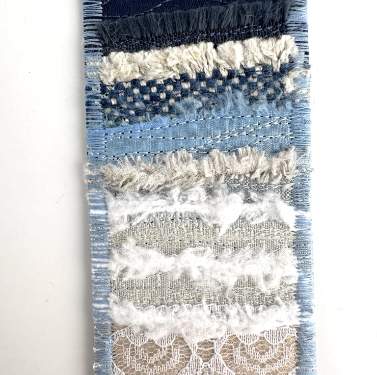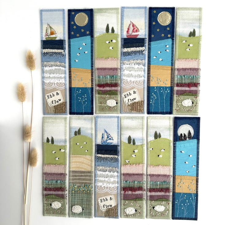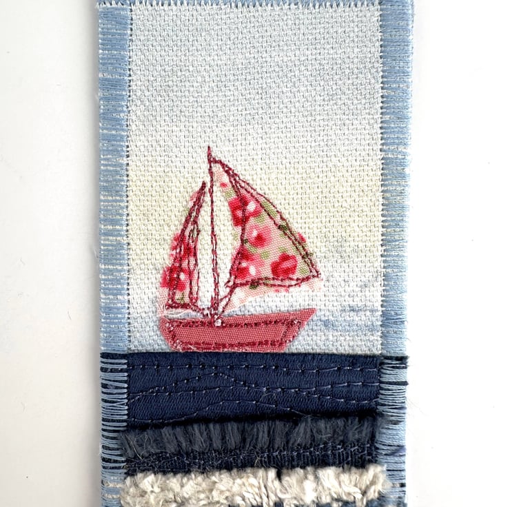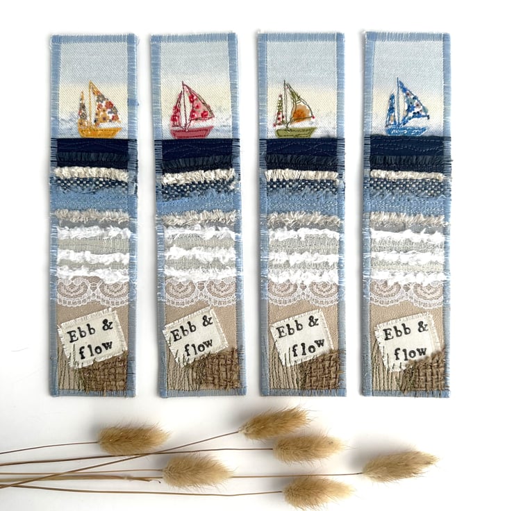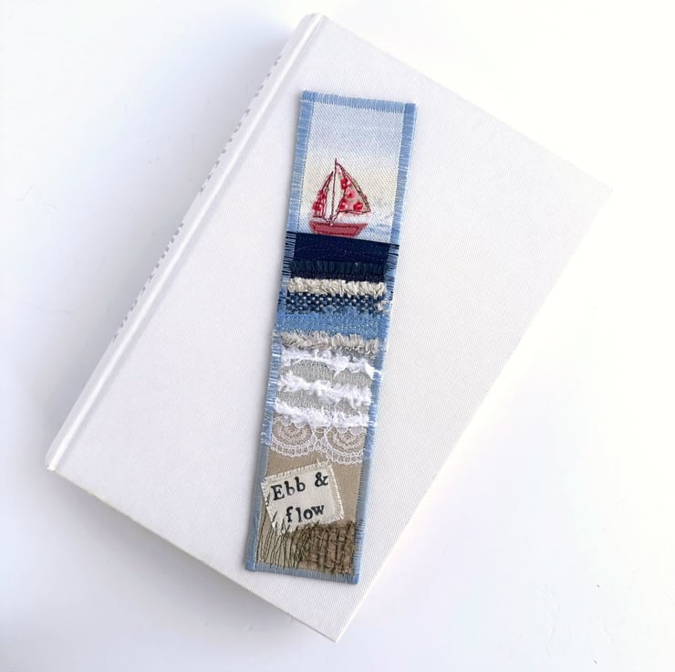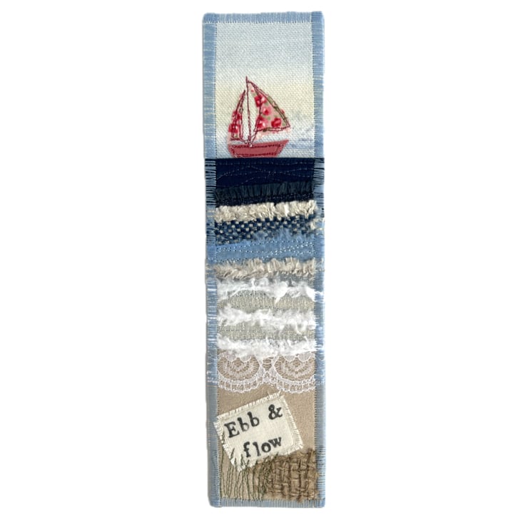 This lovely beach themed bookmark is made from a mixture of different fabrics and has been free-motion embroidered. The design features waves breaking onto a sandy beach under a partly cloudy sky. There is a cute little pink floral sailing yacht on the horizon. The sea is depicted in shades of blue and white, and is made up of layers of different fabrics, along with fluffy yarn, lace and fabric selvedge. The sandy beach is made from pale beige fabric with a suede-like finish. On the beach I’ve added a piece of frayed cream cotton, on which I’ve hand-stamped the words “Ebb & flow” in black ink (this has then been ironed to make it water-resistant). I’ve also added a piece of hessian, and some free-motion embroidered grasses. The bookmark is backed with pale blue fabric with an abstract pattern of silvery cream lines. It is stiffened with an inner layer of interfacing, and edged with zig-zag stitching in blue thread.