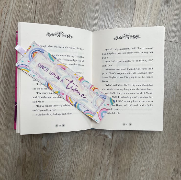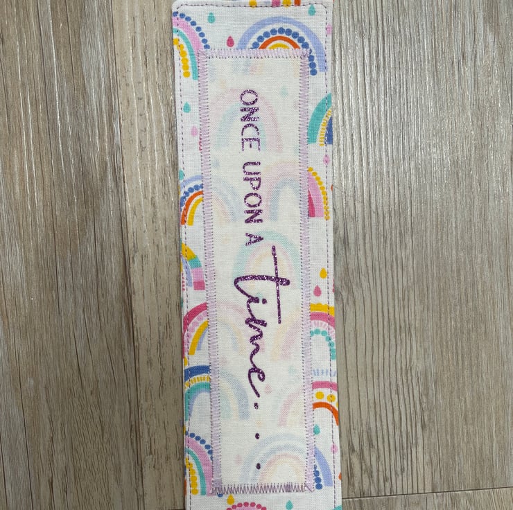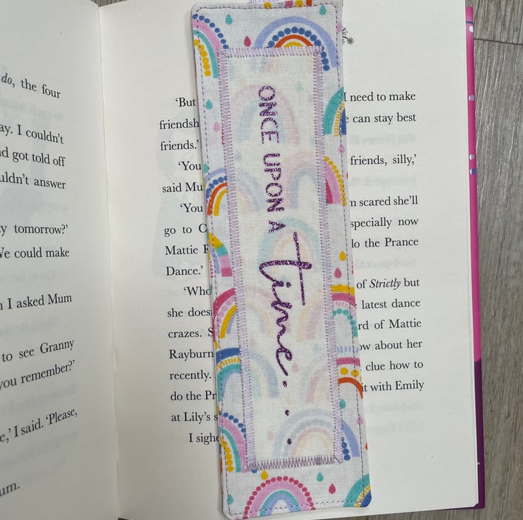 Colourful rainbow fabric bookmark, personalised with the words once upon a time I purple glitter ideal for any keen reader. Can be personalised with a name instead of once upon a time.