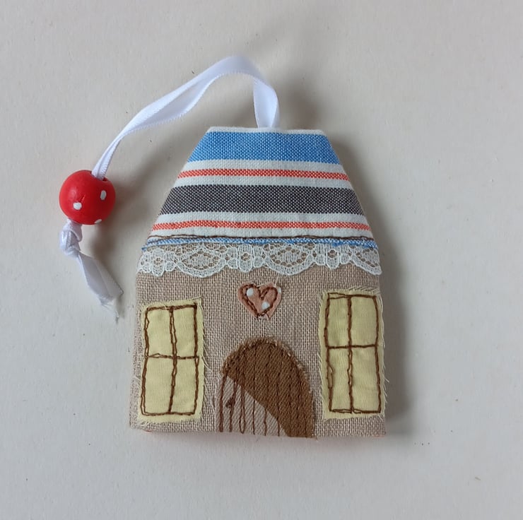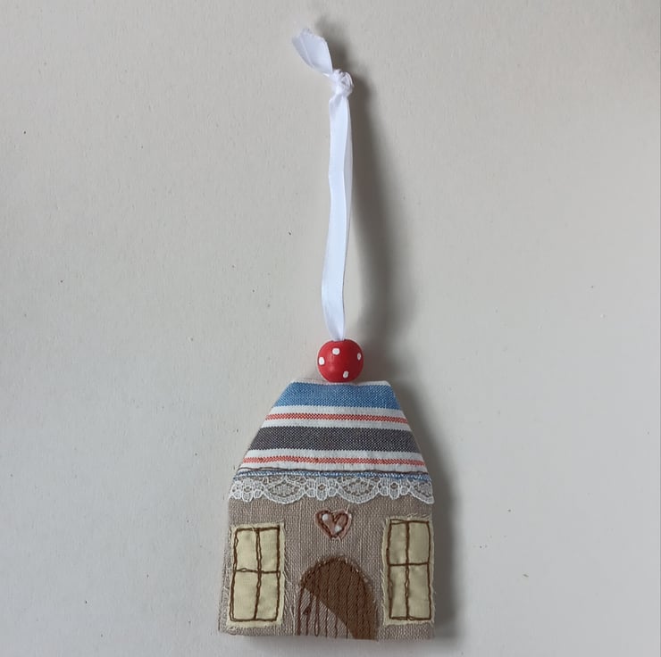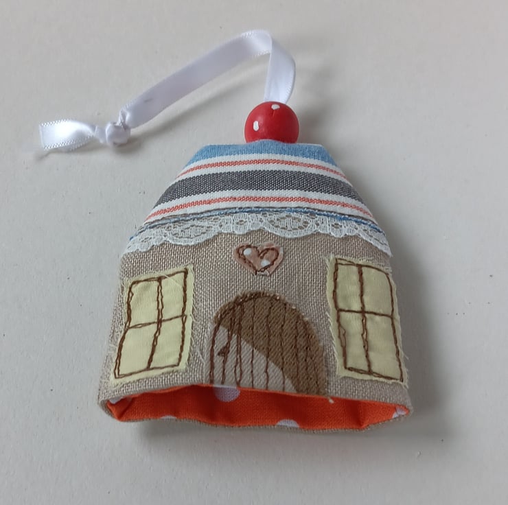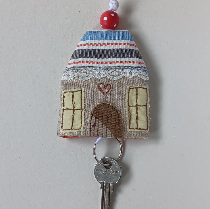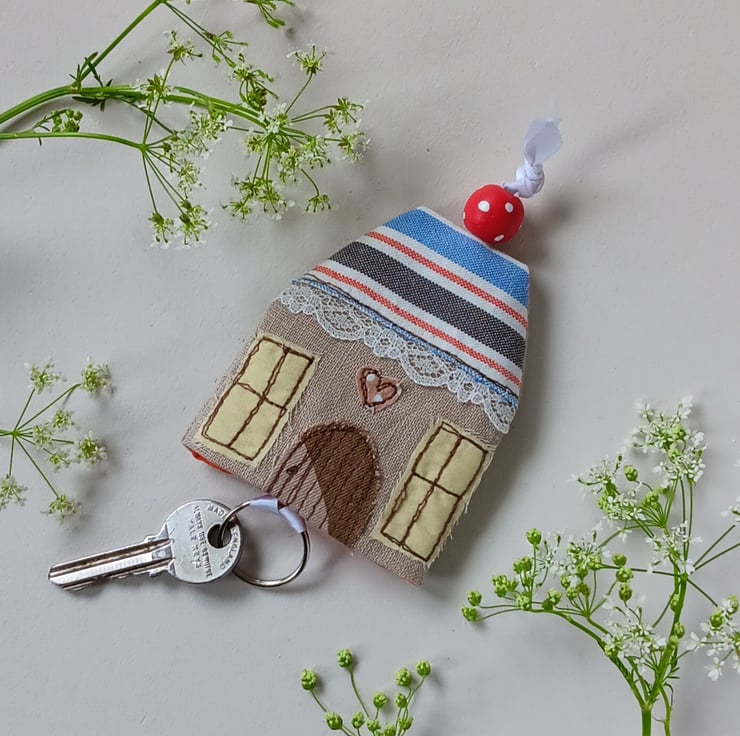 A little pouch to keep your keys safe and to stop them scratching anything in your bag or pocket. Pop your keys on the split ring then pull them up inside the pouch and the wooden bead helps keep them in place. The pouch is made from linen with a house design appliqued and embroidered on the front, using free motion embroidery. It has an orange spotty lining, a red and blue stripy roof and a beautiful red spotty wooden bead on a white ribbon. The pouch measures approximately 9cm high and 7.5cm wide. Would make a great new home gift.