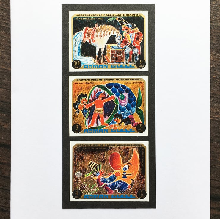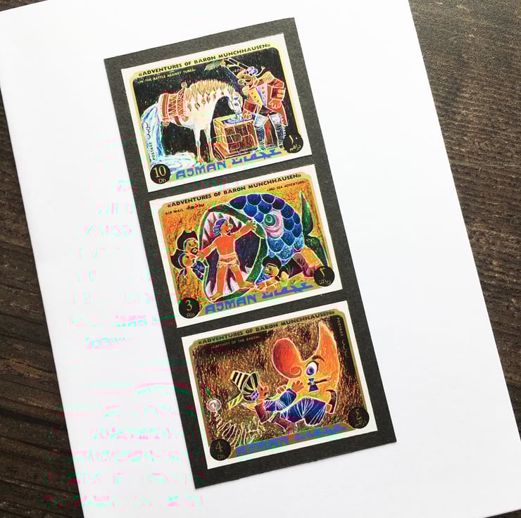 Here's a fun card for a friend or relative. I've used three colourful stamps from Ajman and mounted them onto black paper. The stamps feature illustrations depicting the crazy adventures of Baron Munchausen and have a lively, party vibe.