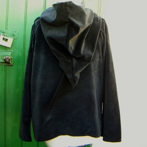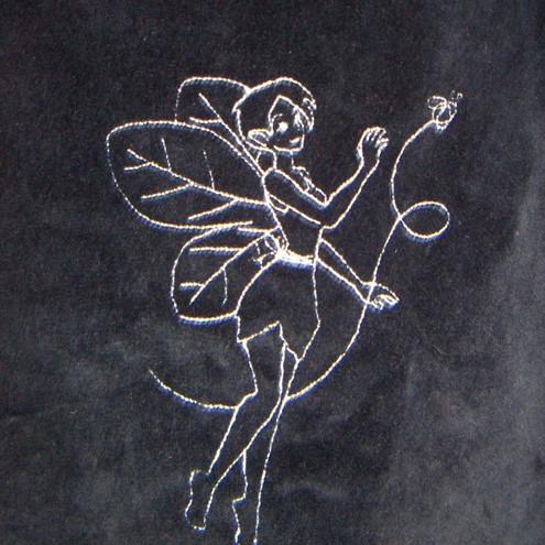 This is a velvet hoody in 100% cotton matte black velvet. On the right hand size is a machine embroidered fairy in white. It is loose fit and the hoody is a lond pixie peak.