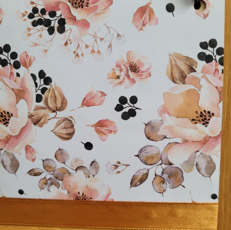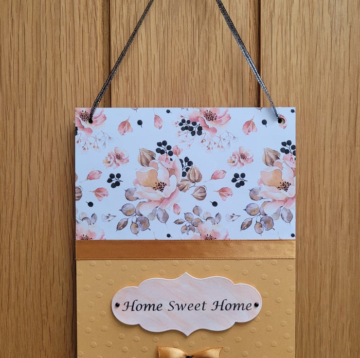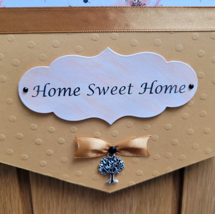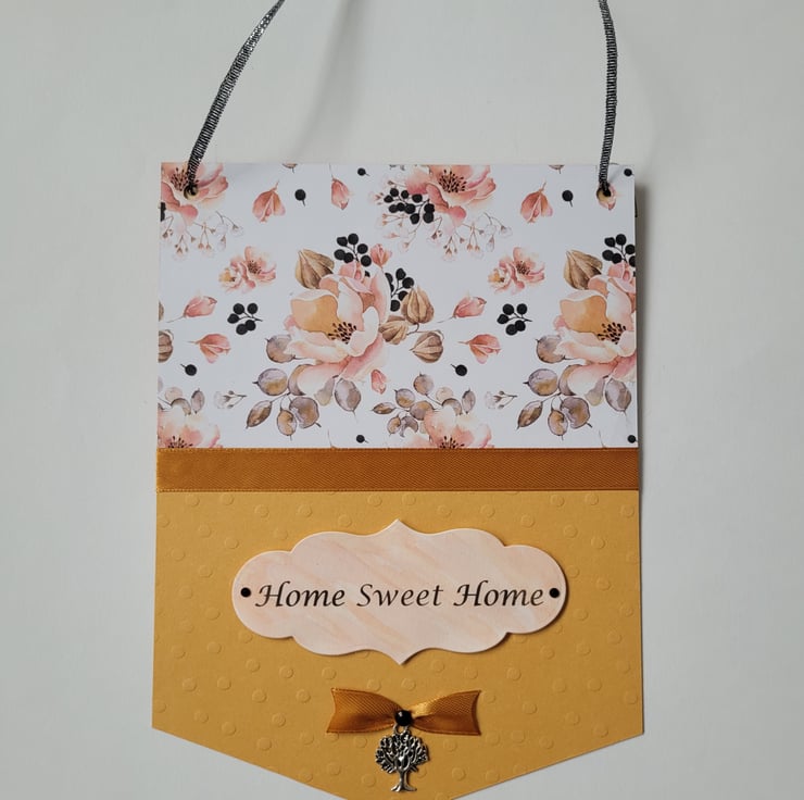 Mixed-media hanging wall decoration made from quality textured and floral patterned card, satin ribbon and a silver family tree charm.