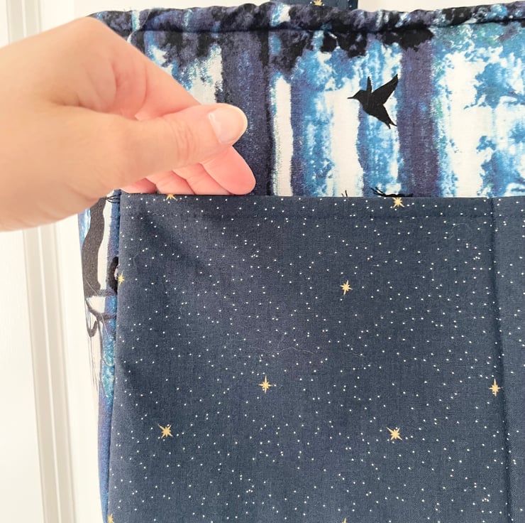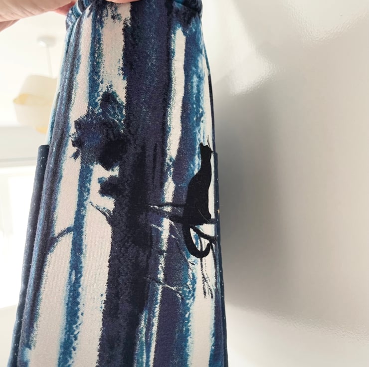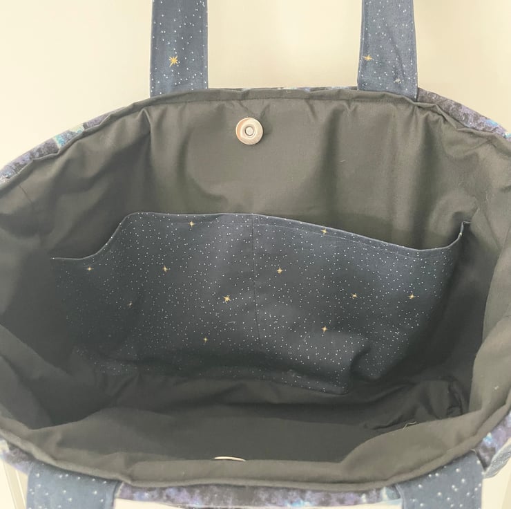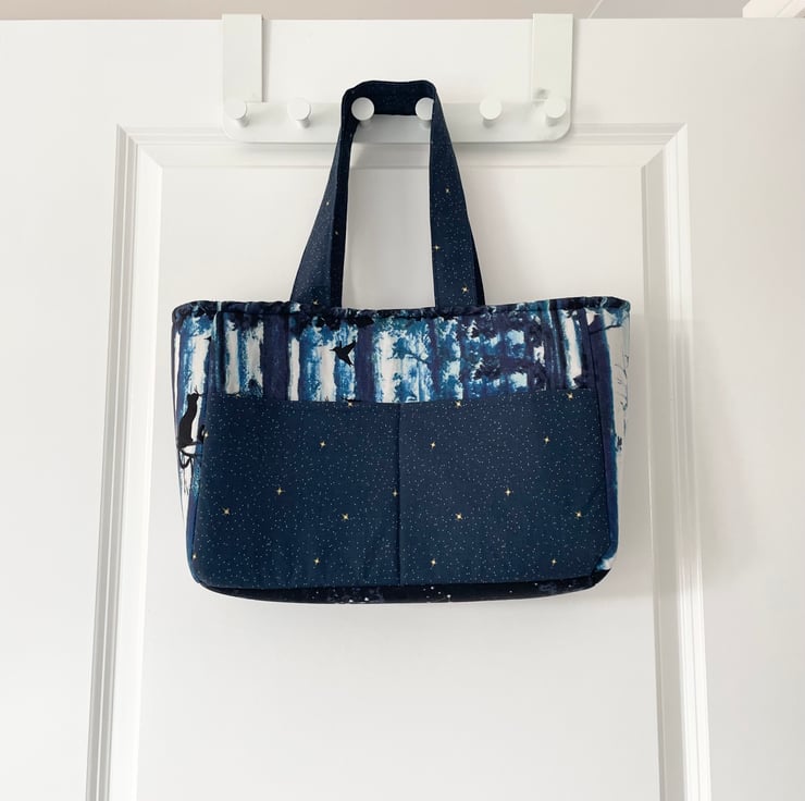 Made from a cotton Lindy Bop dress, this unique bag is fully lined and features both exterior & interior pockets. It has a silver magnetic clasp for security. A cats at night-time design, combined with a gold star design fabric, makes this a truly striking everyday bag. It has a soft, padded feel to it.