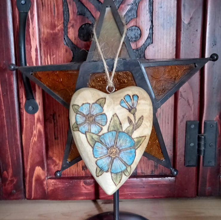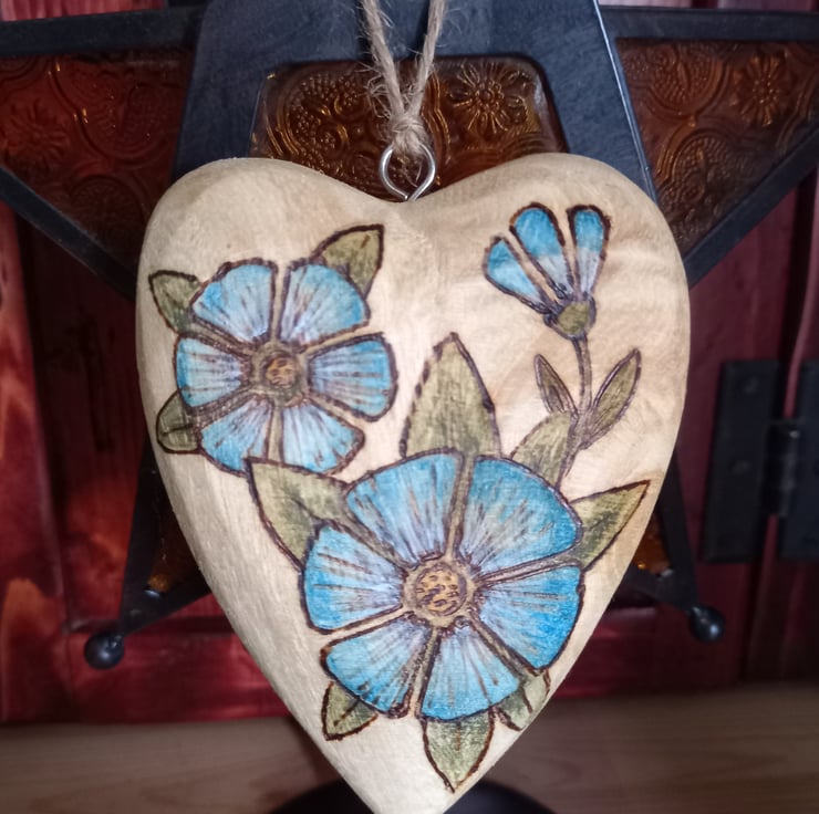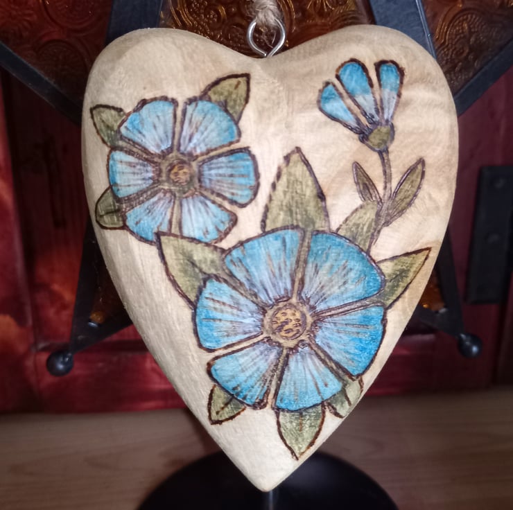 Pyrography wooden blue flower heart decoration
