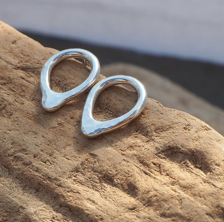 The silver is shaped then heated to fuse the ends. During the heating process I let the silver melt slightly to form a lovely organic shaped droplet. This is then hammered to add a sparkly texture and polished to a bright shine.