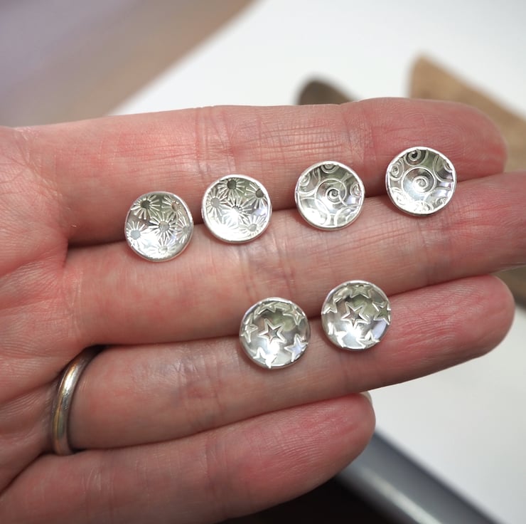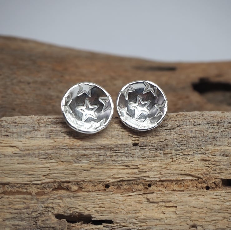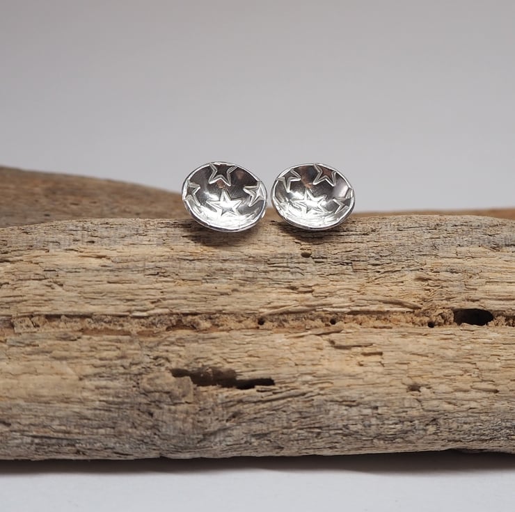 A cluster of stars has been punched into discs of sterling silver to give a pretty surface texture for these earrings. The discs have been domed to create a lovely bowl shape and polished to a bright shine.