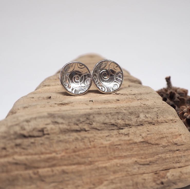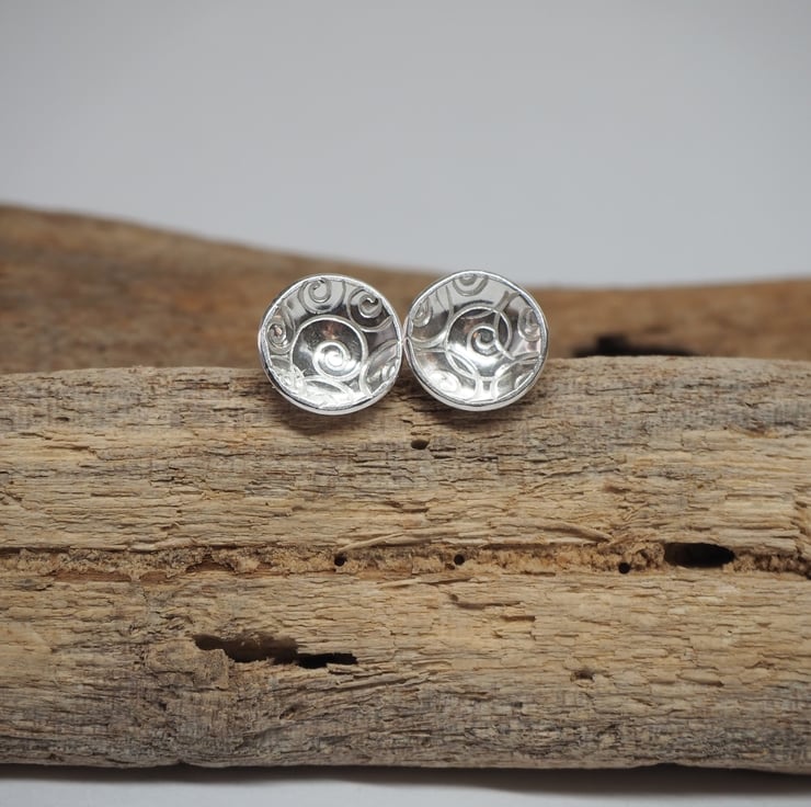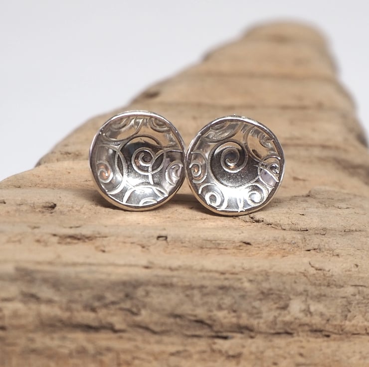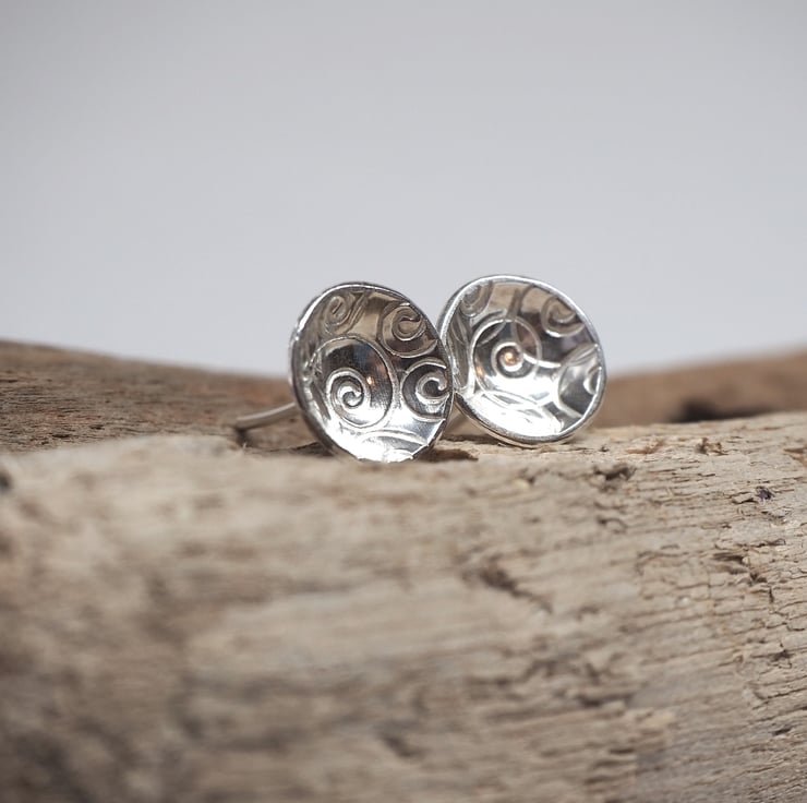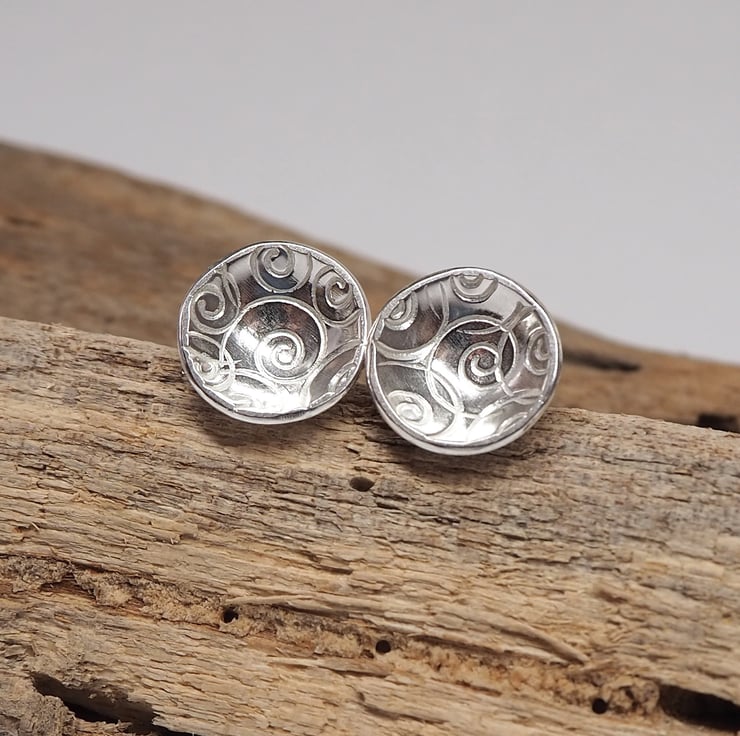 A cluster of spirals has been punched into discs of sterling silver to give a pretty surface texture for these earrings. The discs have been domed to create a lovely bowl shape and polished to a bright shine.