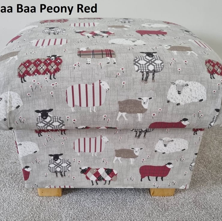 I am a professional upholsterer with over 33 years experience, and have handmade this adult sized STORAGE footstool using iLiv Baa Baa Sheep in Peony Red fabric.