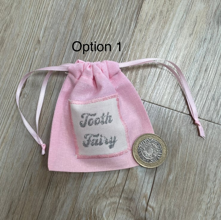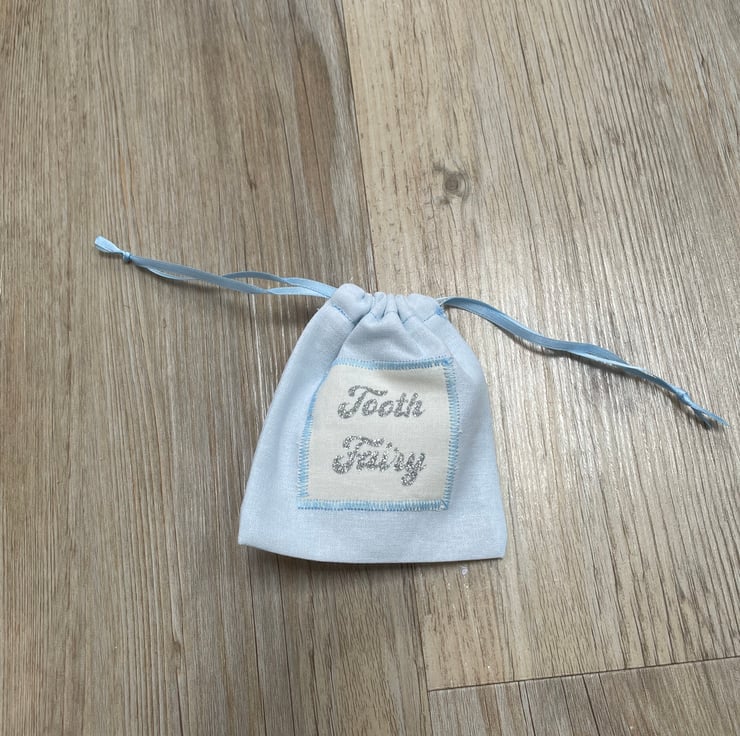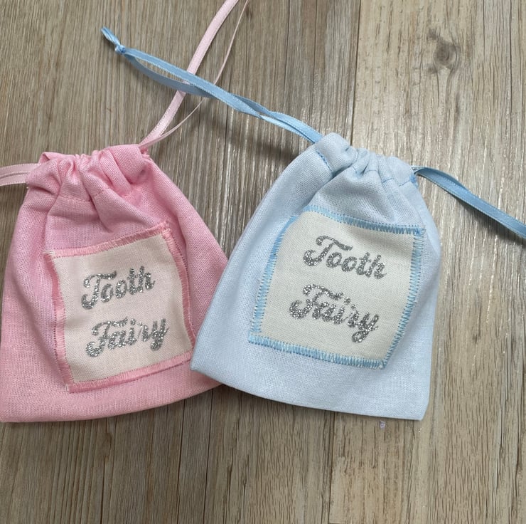 Tooth fairy pouches in blue and pink with sparkly silver wording saying Tooth Fairy or child’s name and tooth fairy bag (Holly’s Tooth fairy bag) Perfect for your little one to pop their tooth in to keep it safe ready for the Tooth Fairy. And big enough for a coin or a small gift.