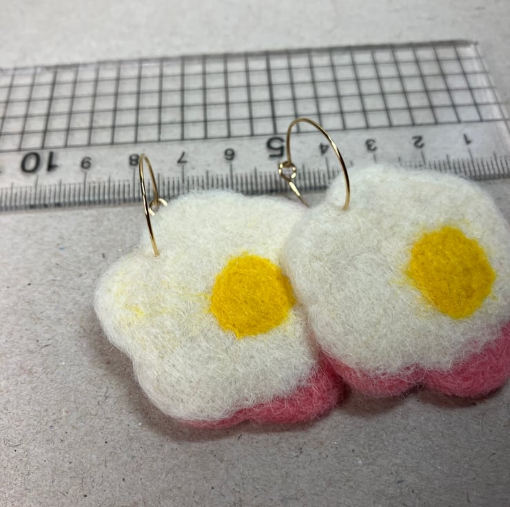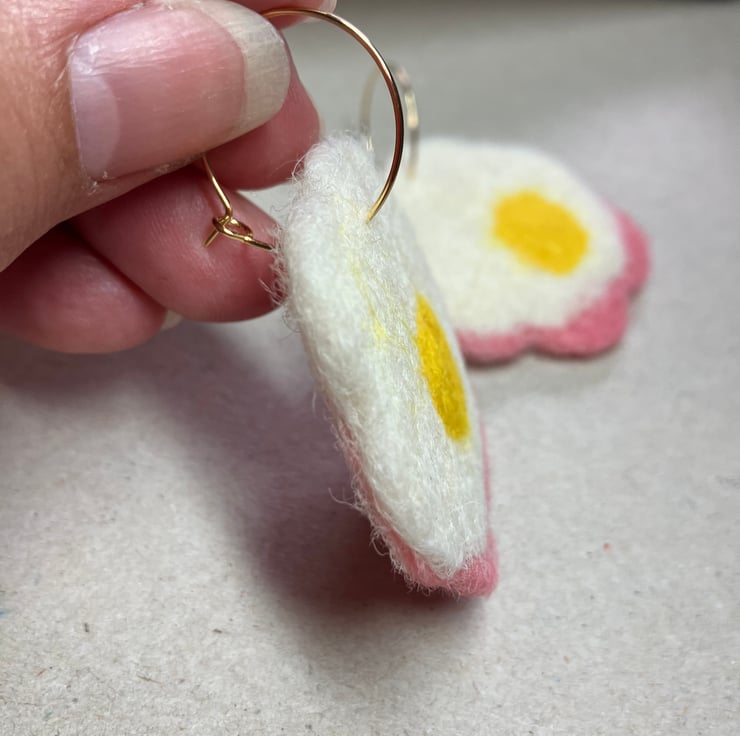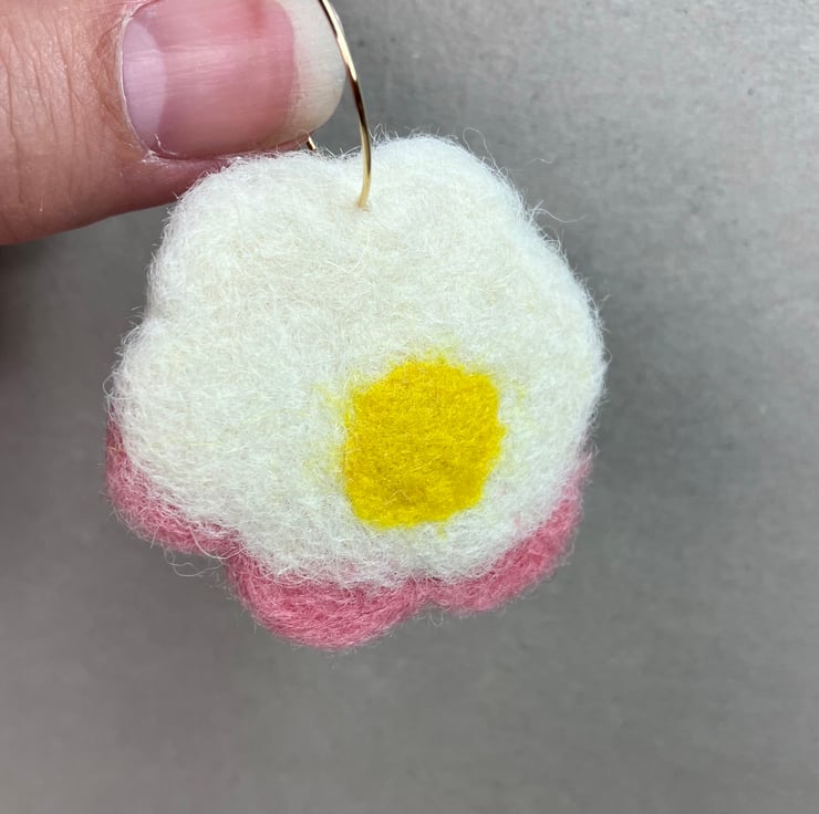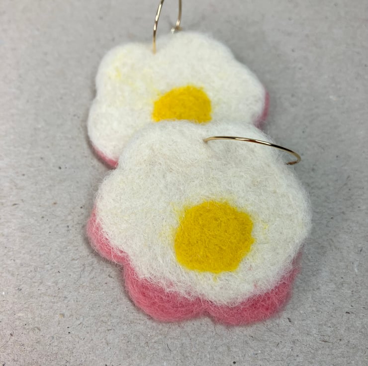 One off Hand felted flower/ fried egg earrings with stainless steel gold coloured hoops