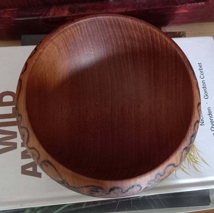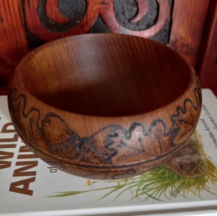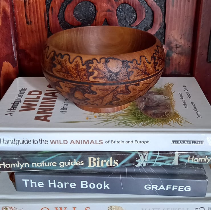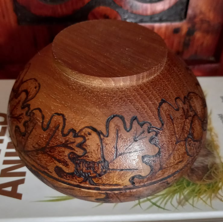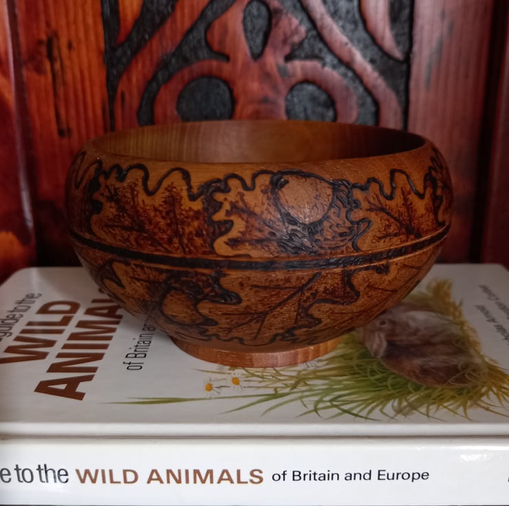 Upcycled wooden bowl illustrated with oak leaves and acorns using pyrography (wood burning).
