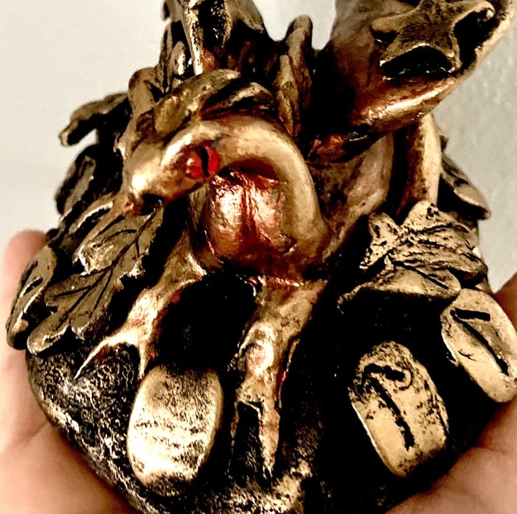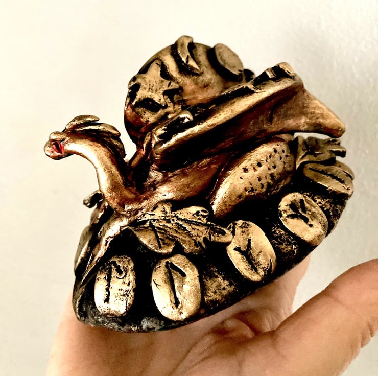 The dragon is sculpted, sanded, painted, aged, given a final coat of metallic bronze and old gold wax and varnished
