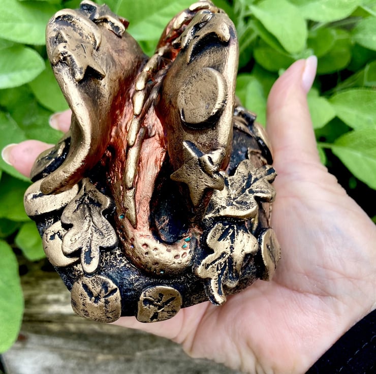 This lovely dragon is sculpted from Air Dry Clay, an amazing medium which dries rock hard and is similar to ceramic once painted and varnished.
