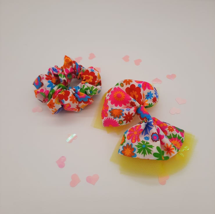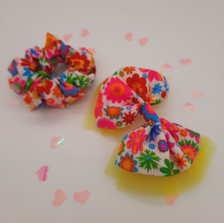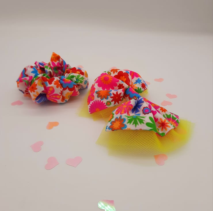 The fabric is a white cotton with a neon flower power print, the bow has a bright yellow tulle backing and a chrome colour clip.