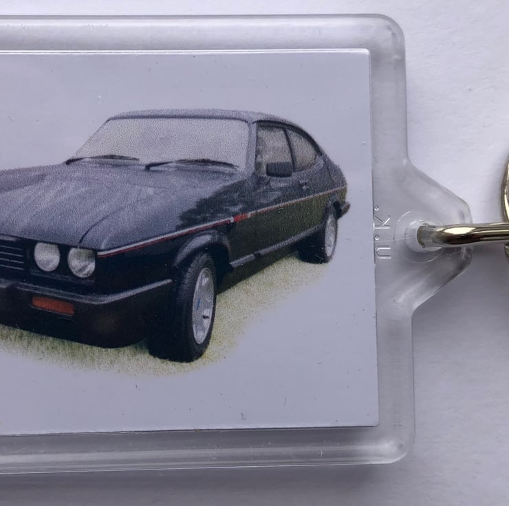 Ford Capri 2.8i 1984 (Black) - Keyring with 50x35mm Insert - Car Fan
