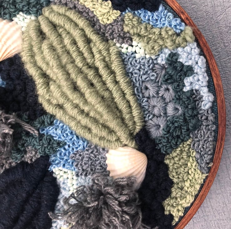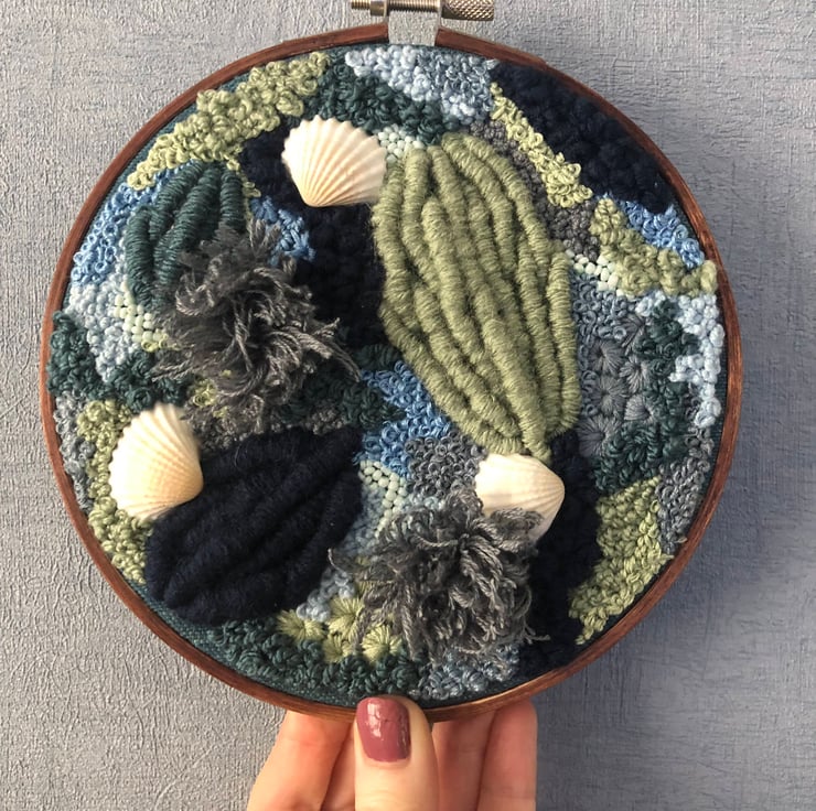 Hidden depths a 6 inch one of a kind hand embroidered home decor art piece. Embroidery thread, beads, yarn and shells have been worked together to create a piece of art which is both eye catching and unique