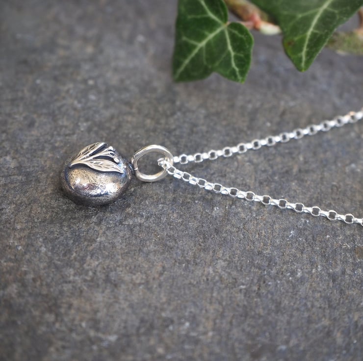 This lovely solid silver pebble pendant is made from recycled sterling silver. It has been hammered on one side to give a lovely texture and has a pretty little silver leaf design to add detail. I have oxidised the pendant to darken the silver then polished the raised areas to highlight the detail.