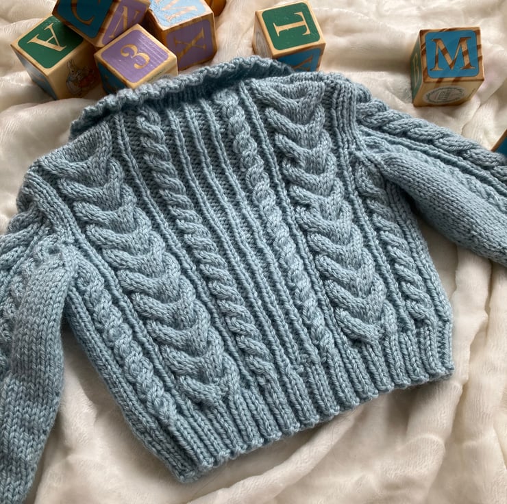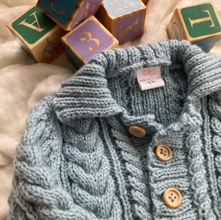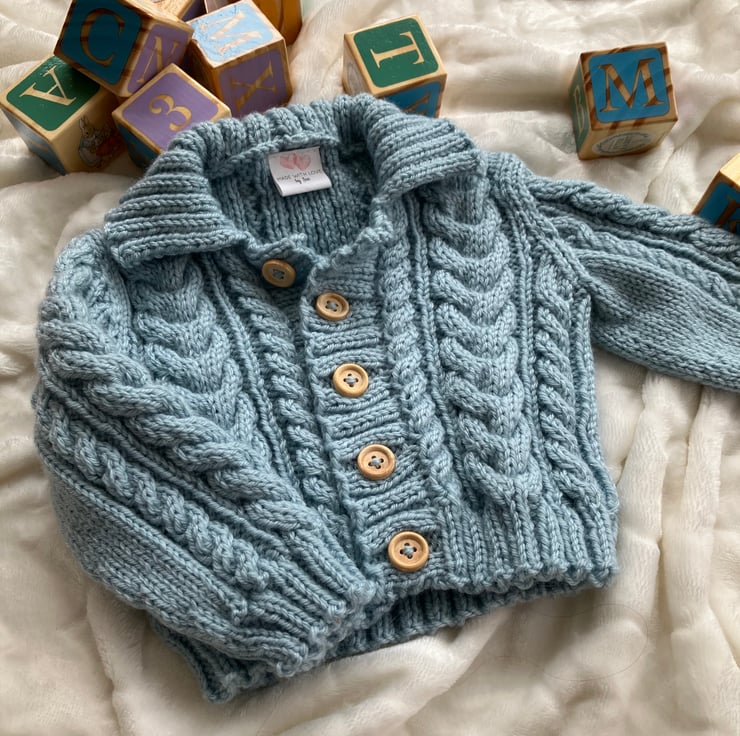 Hand-knitted baby boy’s cable knit cardigan to fit from 0-3 months. I have knitted this gorgeous little cardigan in a super soft duck egg blue premium merino/acrylic blend yarn and finished it off with wooden buttons on the front fastenings. The cable detail covers all aspects of this garment. Perfect for keeping your little one snuggly and warm on cooler days.