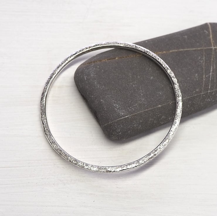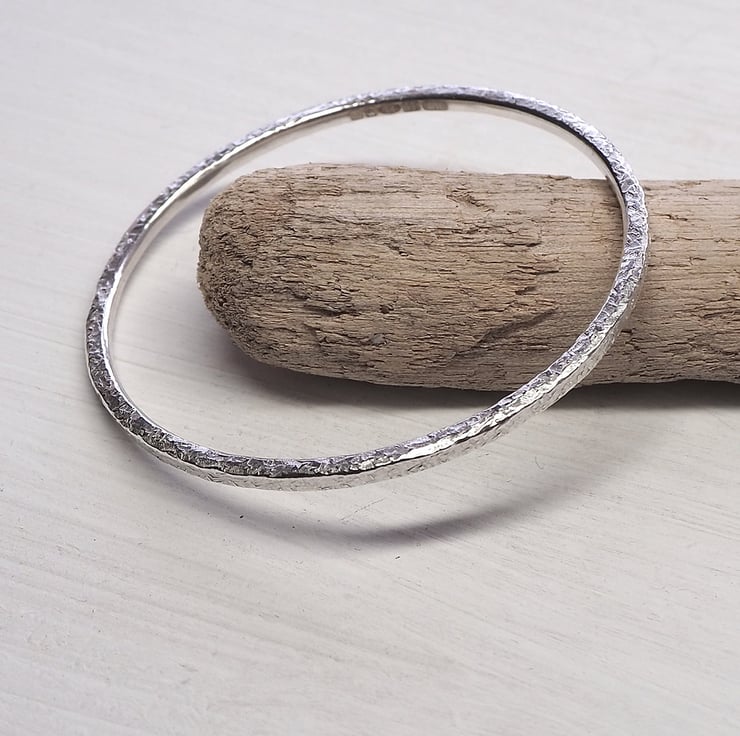 Solid sterling silver bangle with sparkly hammered texture. This silver bangle has been finished with a texturing hammer to create a lovely sparkly texture to three sides of the bangle. The silver is then polished to a bright shine.