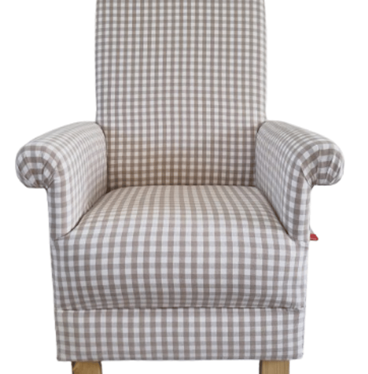 This is a handcrafted, sturdy adult sized armchair, which has been made by myself, a professional upholsterer with over 32 years experience, using Beige Natural Gingham fabric.