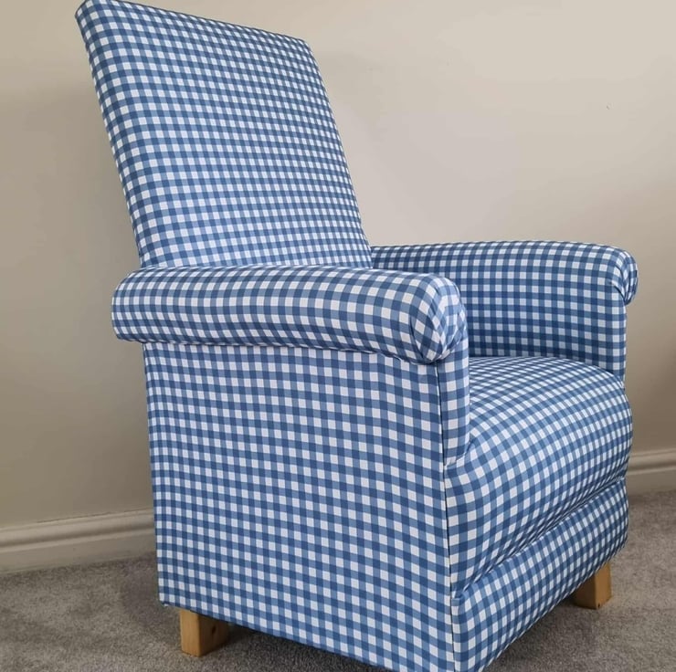 This is a handcrafted, sturdy adult sized armchair, which has been made by myself, a professional upholsterer with over 32 years experience, using Blue Gingham fabric.