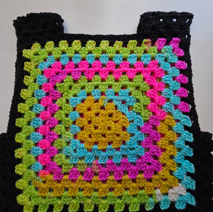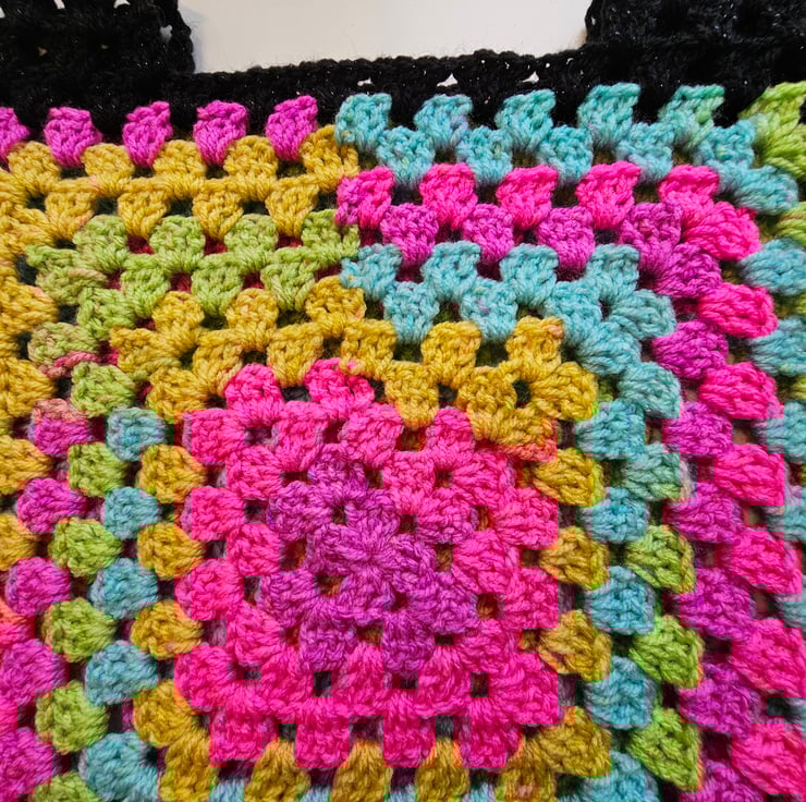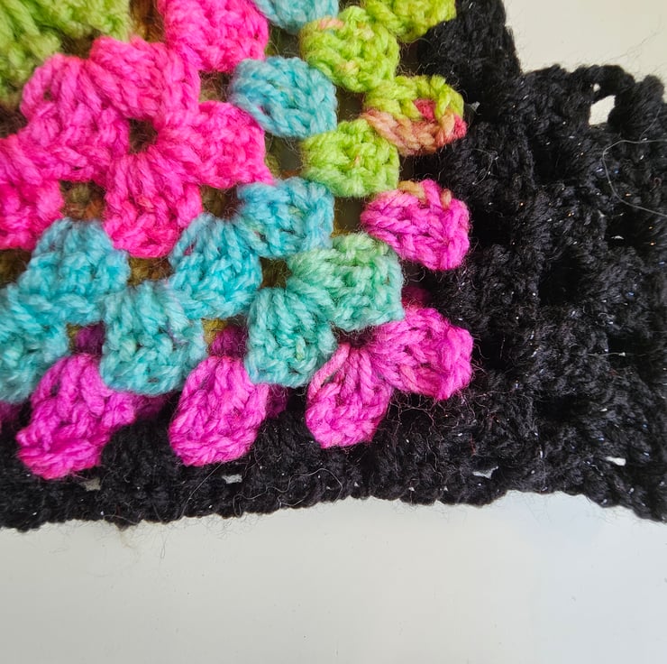 It has been crocheted in a multi coloured yarn with an edging crocheted in black sparkly yarn (difficult to capture with my camera).