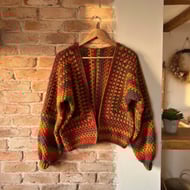 I wanted to make an oversize puffy sleeve cardigan and the yarn I choose suits a granny square well, it offers self striping colours which means I can make a whole panel without having to change colours each time. It’s cosy for the winter, but also offers itself well as a cooler evening coverup with breathable spaces in the design so you don’t over heat.