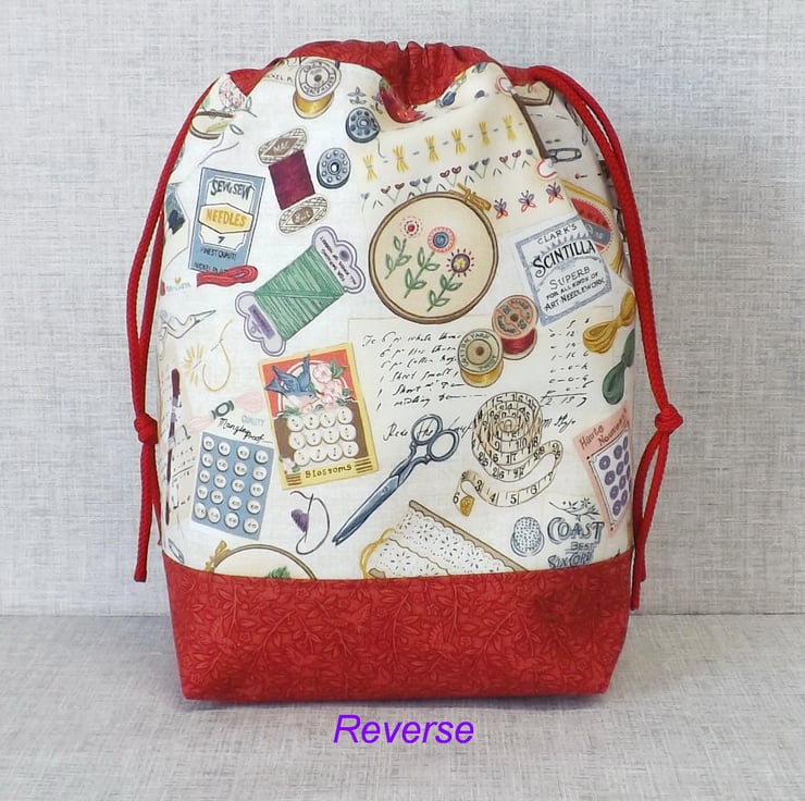 A project bag, drawstring bag, made from a lovely cotton fabric with a design printed with items used when stitching in lots of different colours on a cream background, combined with a red tonal fabric with a bird and leaf print.. The lining is cream cotton with small red stars.