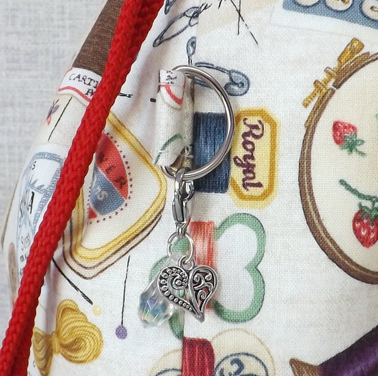 I have included a charm/stitch holder which is attached to a D ring on one side of the bag, and the bag closes with matching drawstrings.