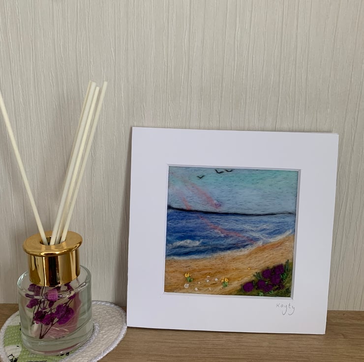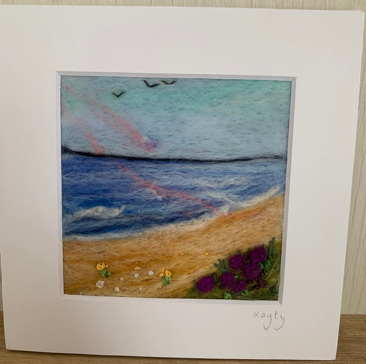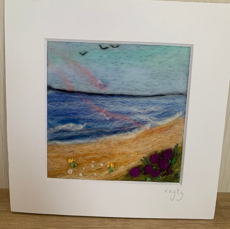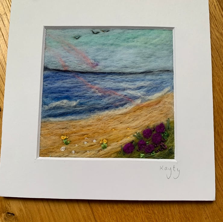 By the Seashore. This lovely view of the sea has been needle felted with hand embroidery detail. The piece is 4x4 inches and mounted in a 6x6 card mount ready to pop in a frame of your choice.
