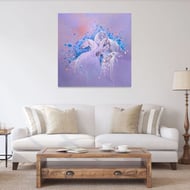 The Spell Caster is a warm, colourful autumn woodland path semi-abstract painting with barn owl. It is 30x30x1.5 inches. The painting is mostly orange and purple and though is clearly of woodland, it is built up with many transparent layers of rainbow colours and vertical marks and drips that give the painting the idea of it flickering in and out of a different reality. I find woodland magical and I find owls magical and I love autumn so this is the combination of those things. It was mostly inspired by some of areas of woodland around the Ashdown Forest in Sussex where you can go quite suddenly from a sunlight heathland into dark and sinister patches of dark forest. Painted on deep edge canvas, edges white, ready to hang, not frame needed and comes with a certificate of authenticity and gifts from the artist.