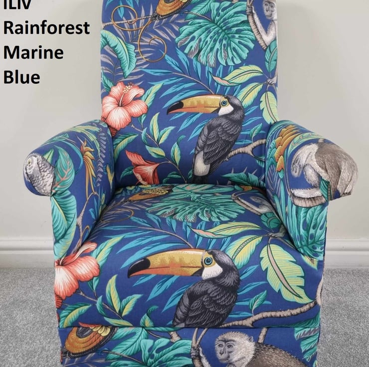 This is a handcrafted, sturdy adult sized armchair, which has been made by myself, a professional upholsterer with over 32 years experience, using iLiv Rainforest Marine Blue fabric.