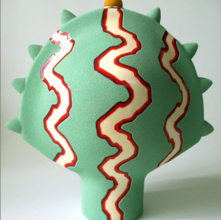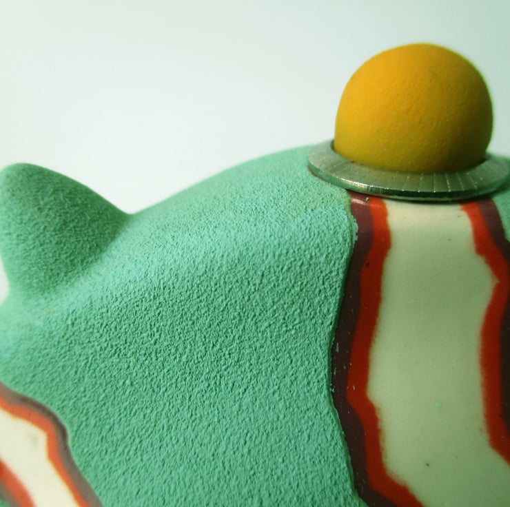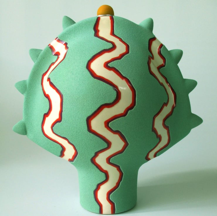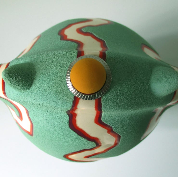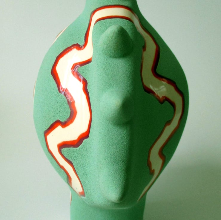 This vase features my own lightly textured matte glaze (painted turquoise) contrasted with glossy cream, red and purple glazes. Each colour is applied and fired in my kiln before the next colour is put on which makes it a lengthy but worthwhile process.